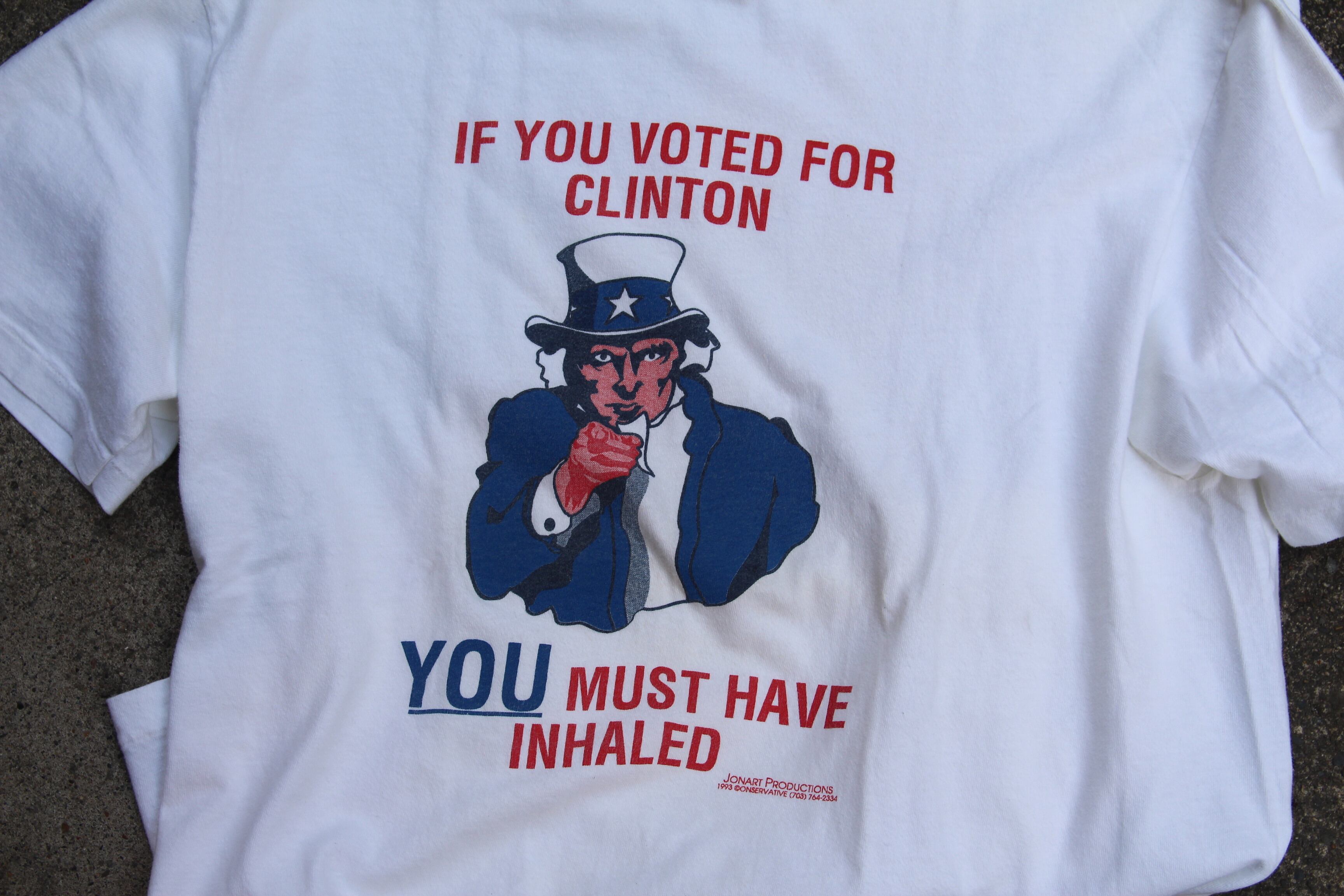 1990年代のHanes製プリントTシャツとなります。プリントはトリコカラーでアメリカの選挙等のモチーフに使われるVoteプリントが入ります。コミカルなキャラクターでプリント配色も多数使いですのでアメリカらしいPOPなイメージなデザインです。オールコットン地でUSA製、袖、裾共にシングルステッチとなります。この手のTシャツがお好きな方は是非この機会にご検討の程宜しくお願いします。
