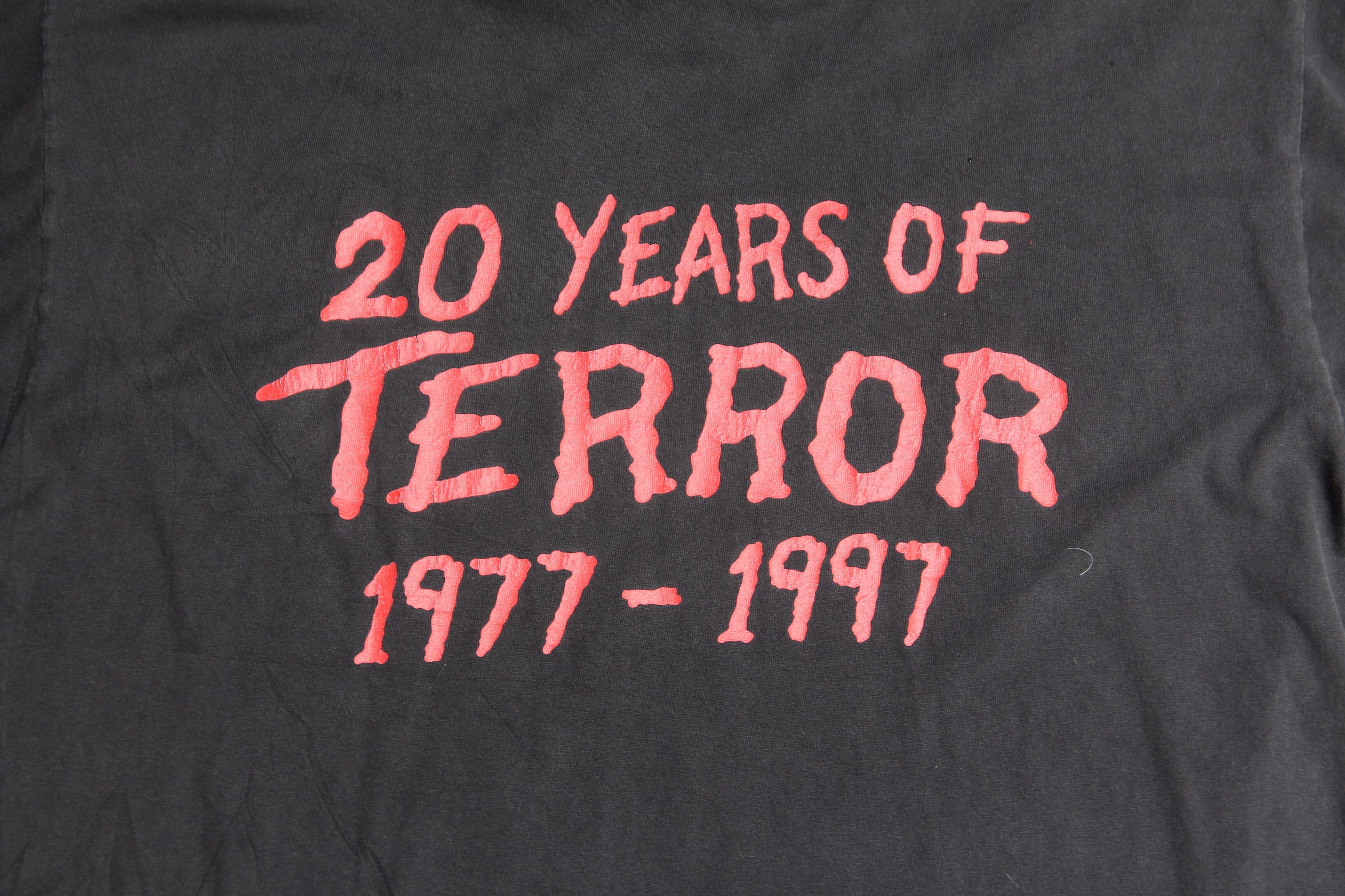 1990年代のブランド不明ミュージックTシャツとなります。アメリカのニュージャージー州で1977年に結成されたハードコア系パンクバンド‘‘MISFITS‘‘のバンドTシャツです。フロントにはミスフィッツのアイコンでもある骸骨が演奏しているインパクトのあるプリントがされており、これぞバンドTシャツといったデザインになっております。バッグには赤く血の様なフォントで‘‘20YEARS OF TERROR 1977-1997‘‘とプリントされており、恐らく20周年を記念した希少価値の高い一着となっております。丁度良く褪せたブラックのボディは90年代のオールドの雰囲気が感じられる色となっており、サイズ感もゆったりとしていて合わせやすいと思います。お好きな方は是非この機会にご検討下さい。