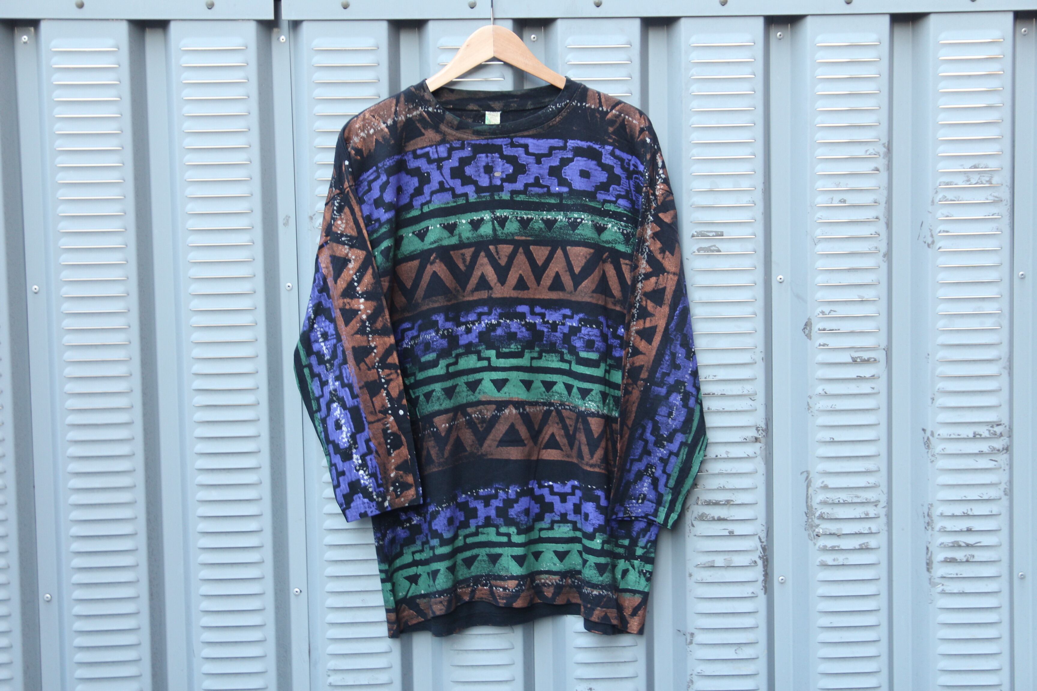 1990年代頃のブランド不明ロングスリーブTシャツとなります。多色使いの総柄プリントでネイティブ柄の様なパターンが大変良い雰囲気となっております。袖にリブが付かないタイプですので野暮ったくなり過ぎず綺麗なシルエットで着用して頂けます。サイズ表記はフリーですが実寸でL程度ですので多少大き目なシルエットですので総柄のTシャツをお探しだった方は是非この機会にご検討宜しくお願いします。