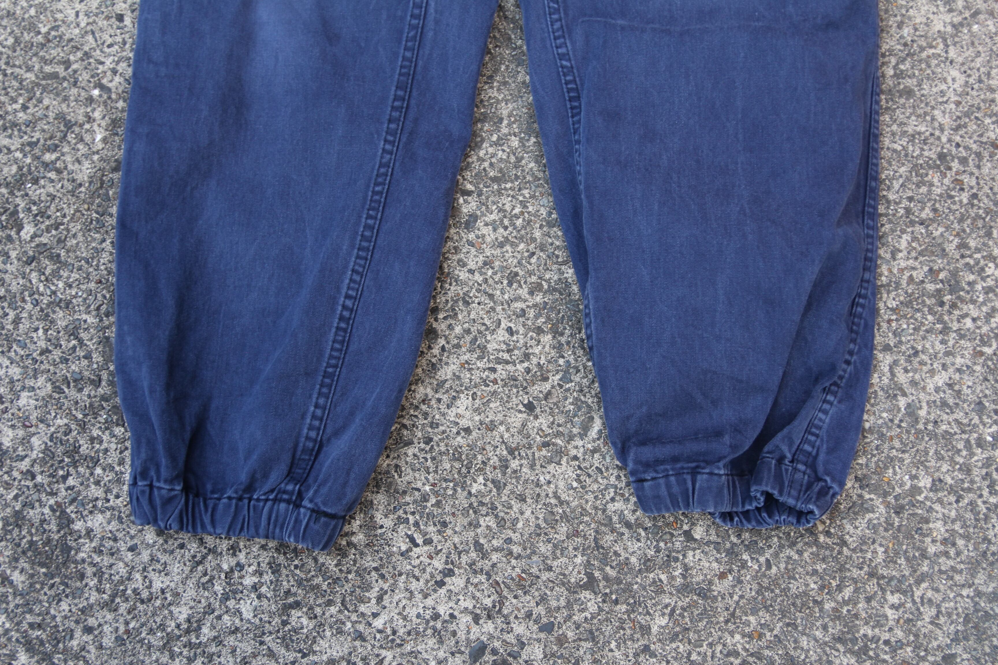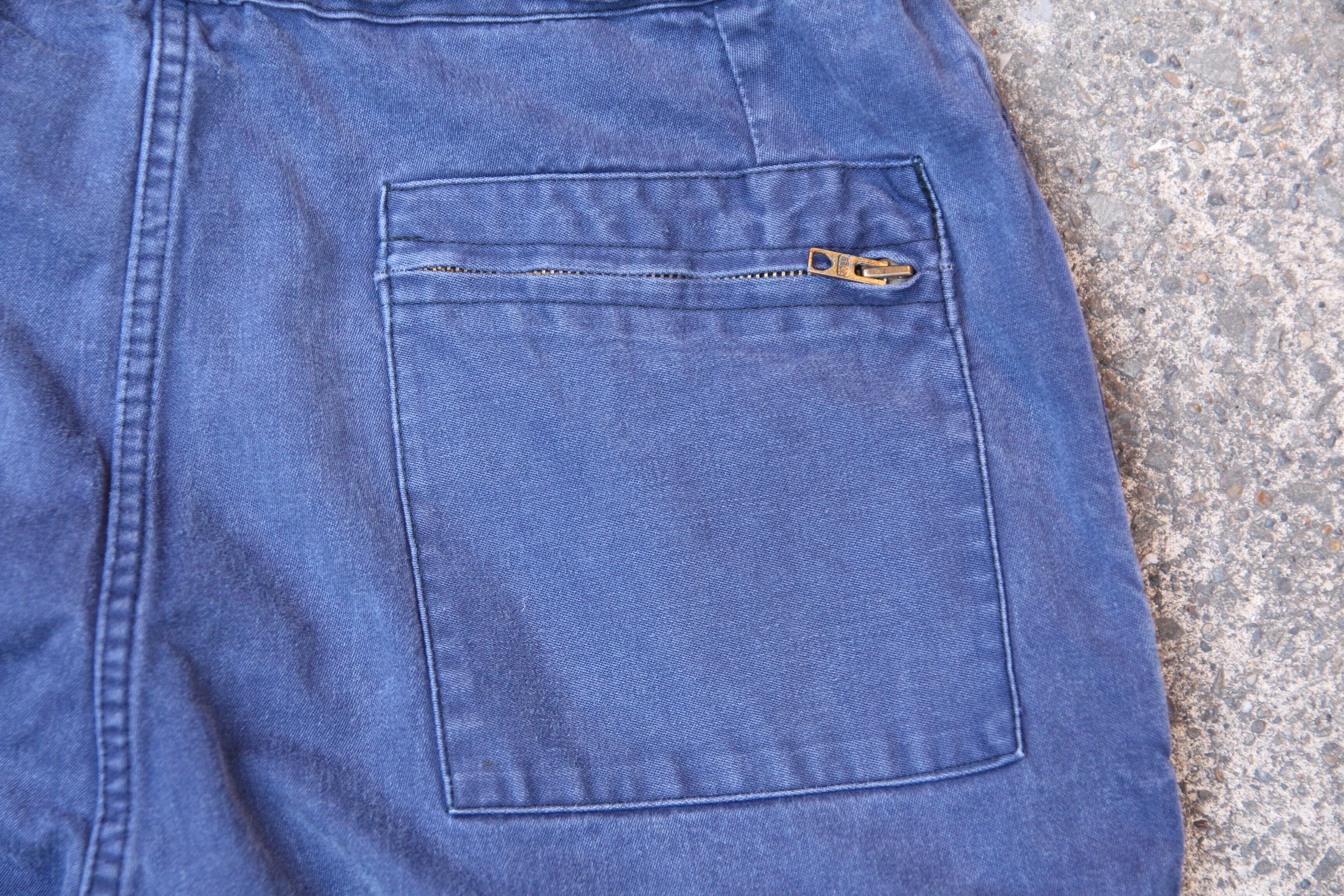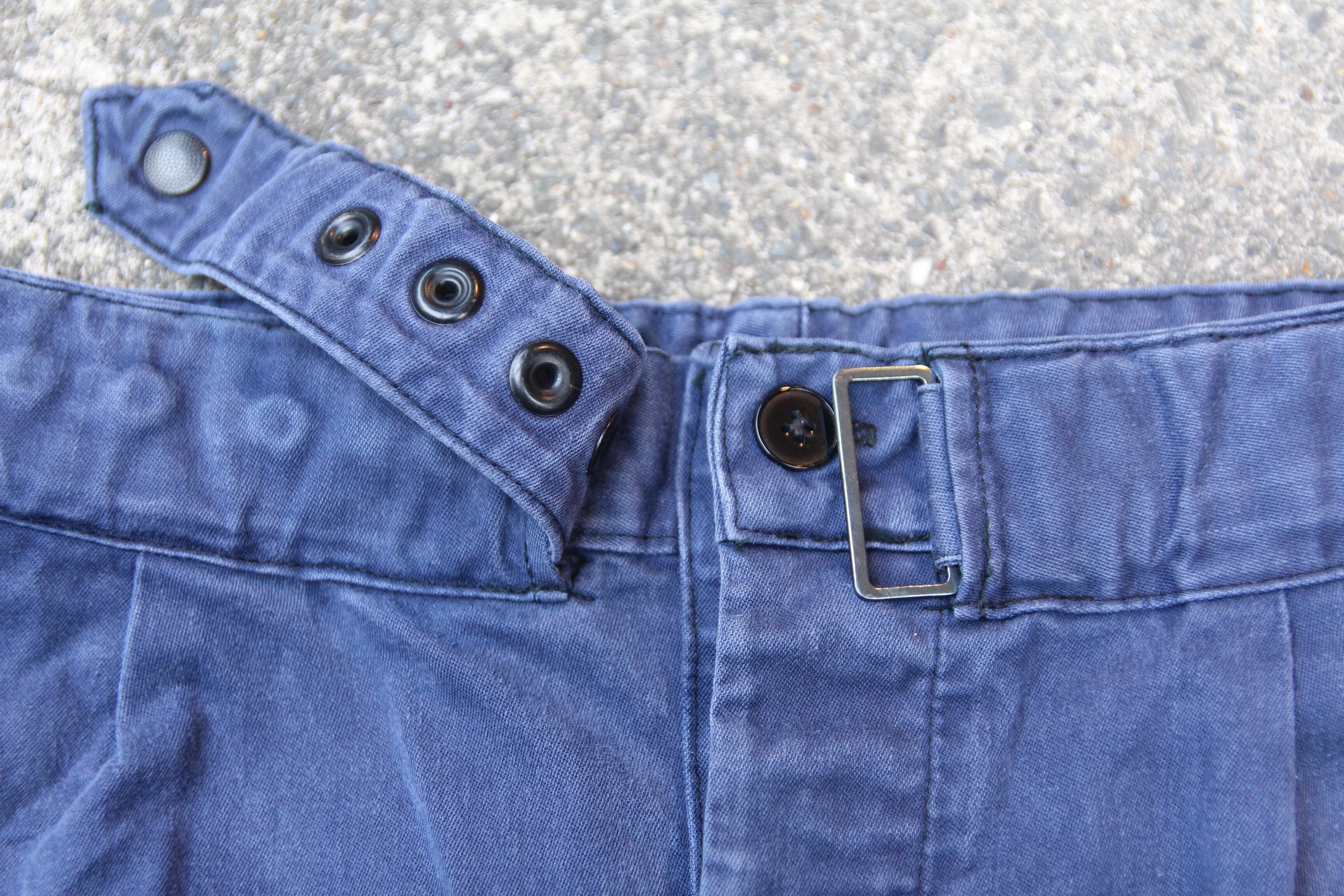 1970年代のRoma製イタリアワークパンツが入荷致しました。ネイビー単色カラーでウエストにスナップベルトが付属されているアメリカ物では見られ難いヨーロッパらしいデザインとなっており、ウエストベルトはスナップボタンで最大で10cmのサイズ調整が出来る様になっているという点に面白差を感じます。素材はユーロワークに多いモールスキン素材に近い光沢感のあるコットン素材です。裾はゴム仕様になっておりますのでシルエットもウエストサイズの割にスッキリと穿いて頂ける仕様になっております。ユーロワークアイテムがお好きな方は是非この機会にご検討の程宜しくお願いします。
