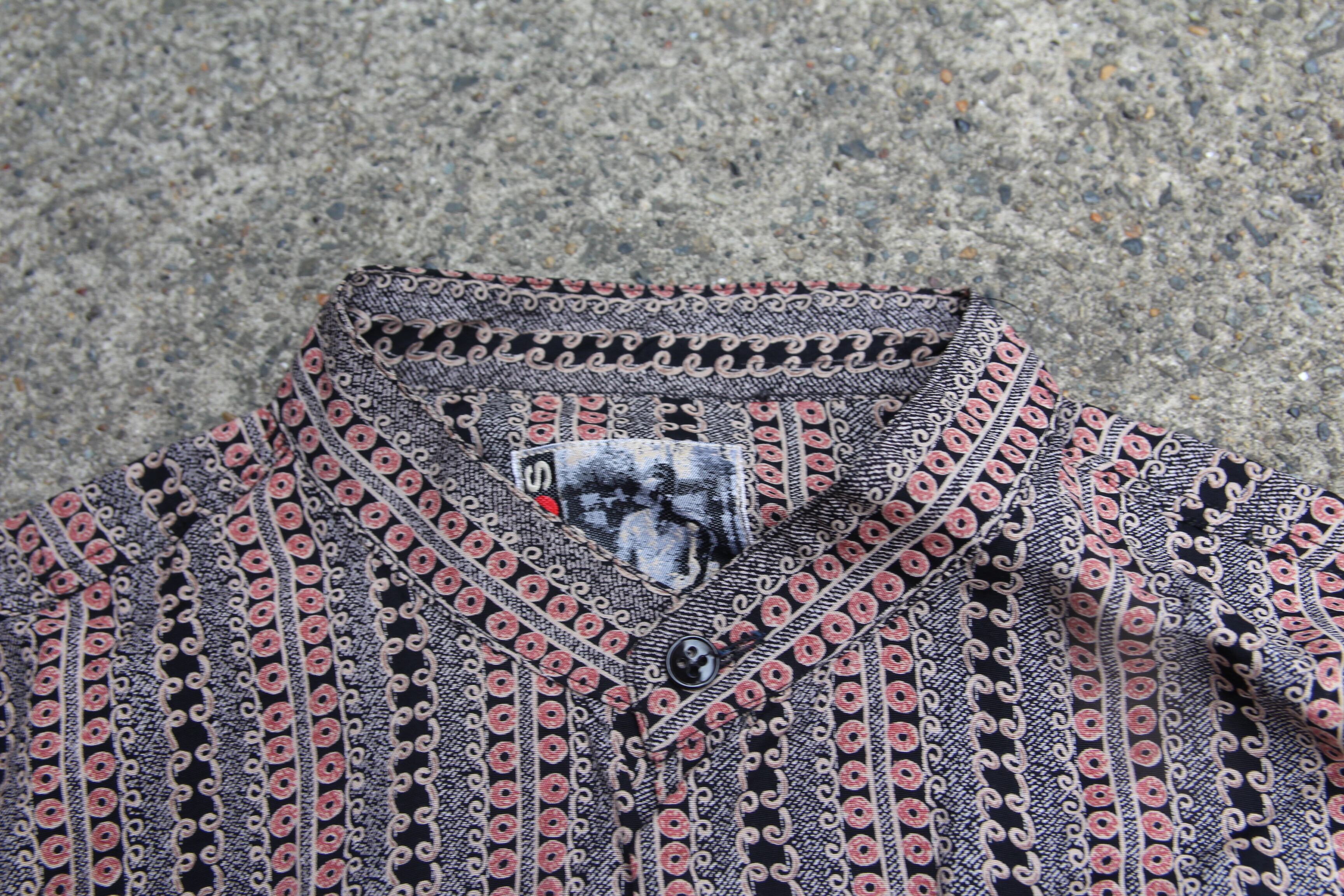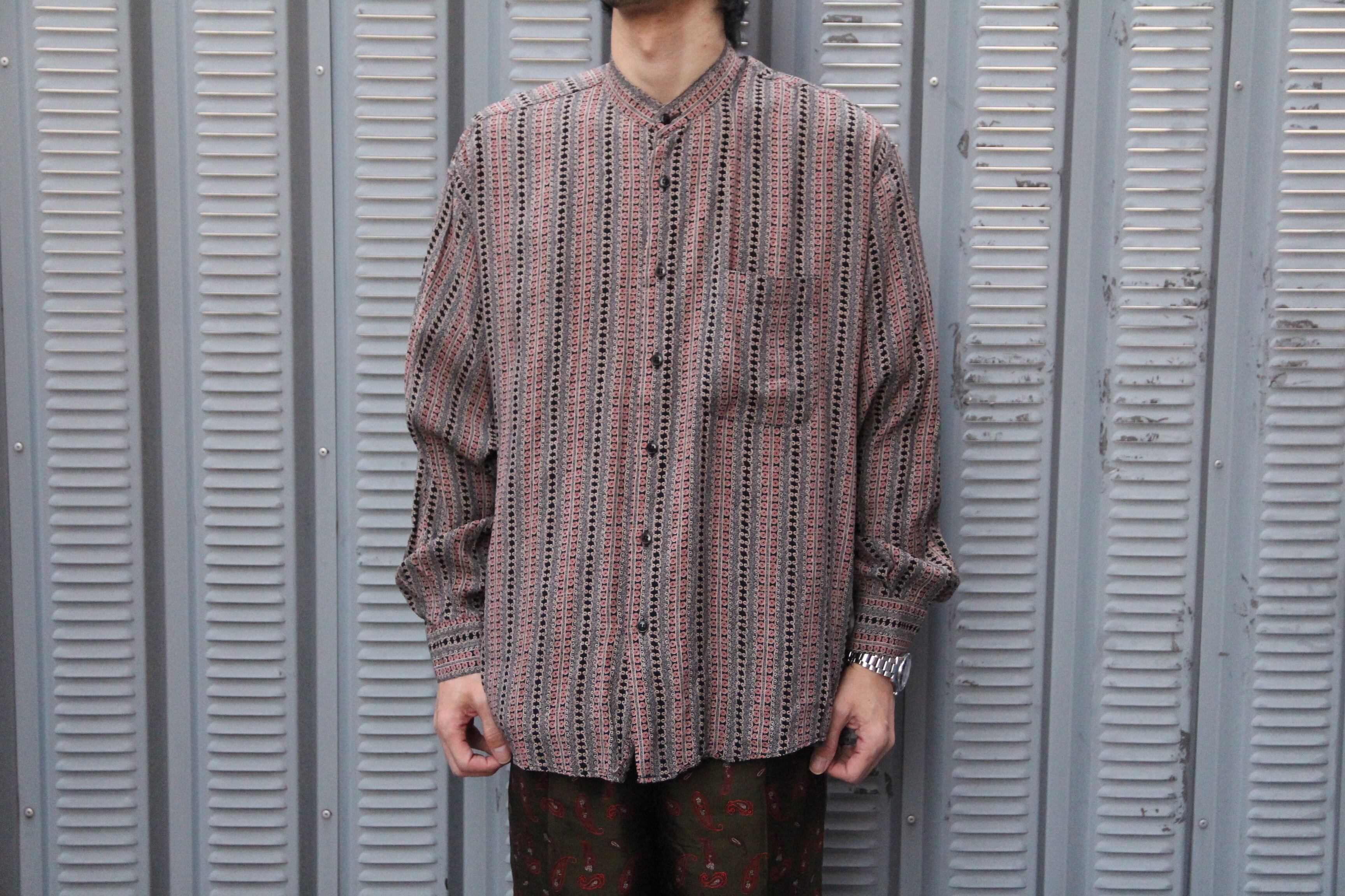 Kantaros製レーヨンシャツとなります。レーヨンシャツでは珍しいカラーレスとなり、片胸ポケット仕様で独特な波模様のストライプ柄となります。タグのデザインも微妙でとても可愛いです。カラーリングも落ち着いたブラウンベースですし、レーヨン地もそこまで薄手の生地感では無く、多少厚手の生地感ですので今時期にもインナーとして着て頂いてもそこまで寒くない程の質感となります。カラーレスのレーヨンシャツは希少ですのでお探しだった方は是非この機会にご検討下さい。