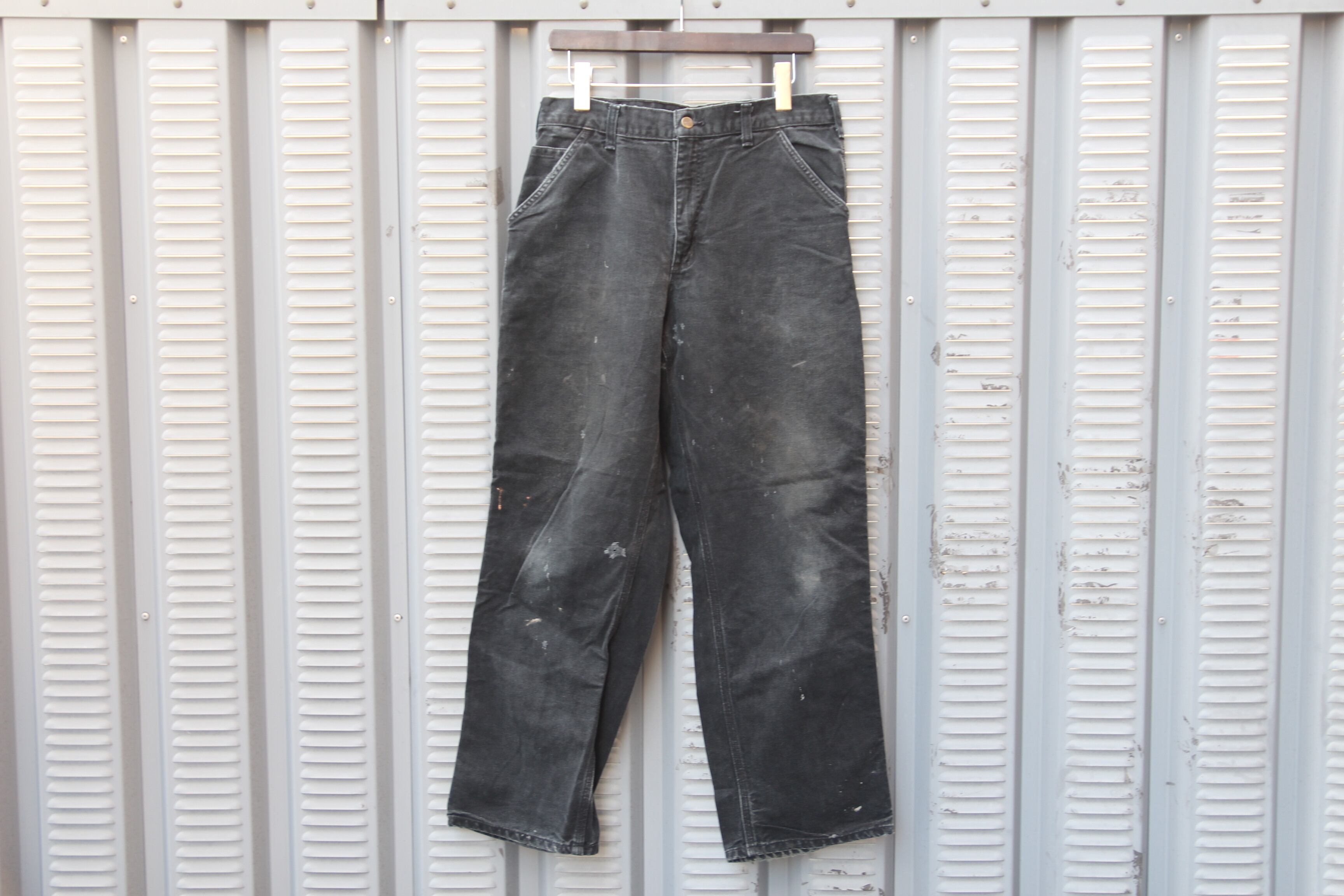 1990年代頃のCarhartt製ダックペインターパンツとなります。ダック地のペインターパンツと言えば思い付くブランドと言える程知名度、人気共に高いカーハートのペインターパンツですが、黒はお探しの方も多い割に中々見かけ難いお色となっておりお探しの方も多いのでは無いでしょうか?ワークパンツらしい大分色褪せた墨黒も大変良い雰囲気ですね。こちらはバック左右にツールポケット、左にハンマーループが付きますが、フロントはダブルニー仕様にならない比較的シンプルなタイプとなります。USA製から移行された90年代後半頃のタグ表記となり、サイズはW33程度とサイズの合う方も多いのでは無いでしょうか?Carharttのダックペインターパンツをお探しだった方は是非この機会にご検討宜しくお願いします。