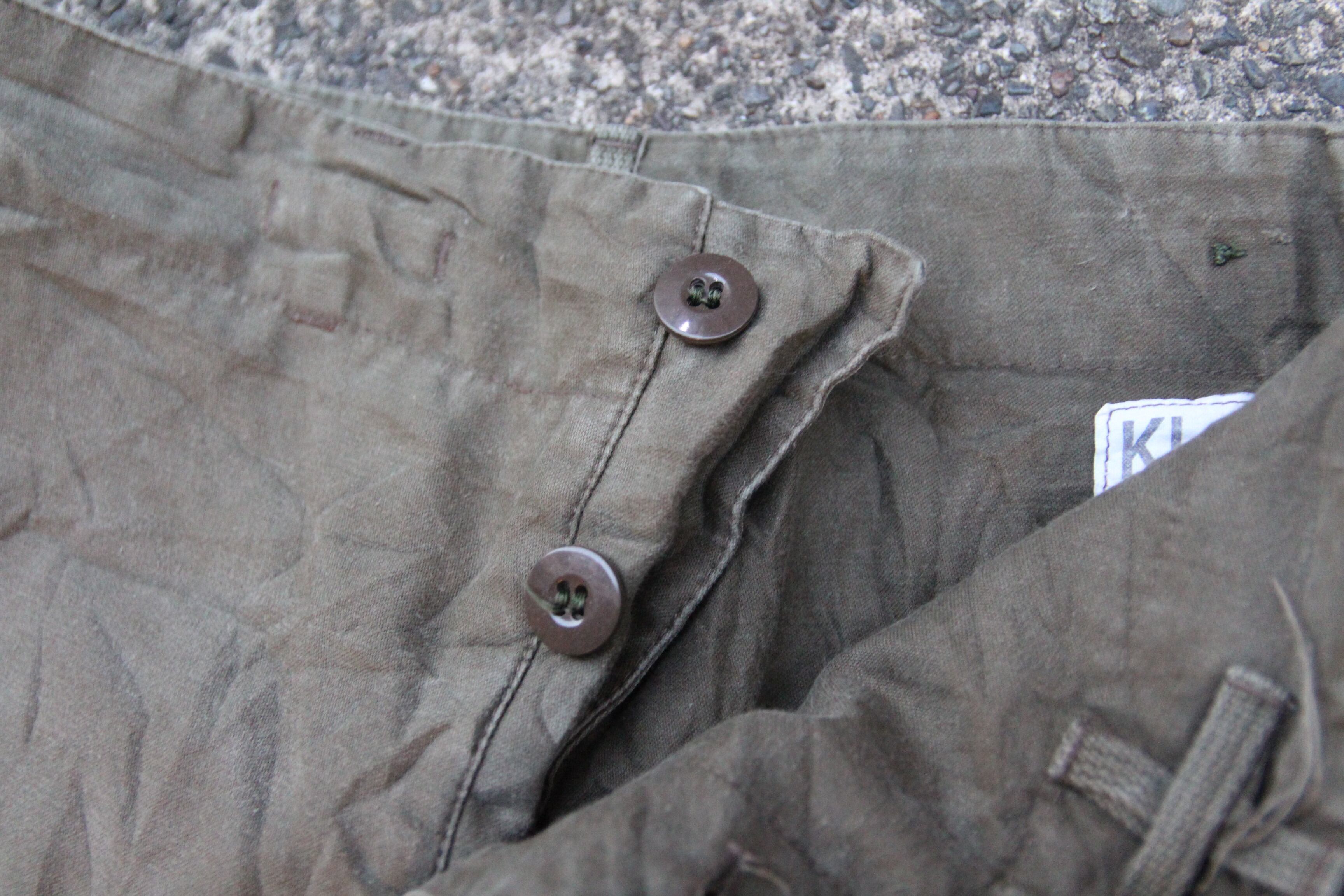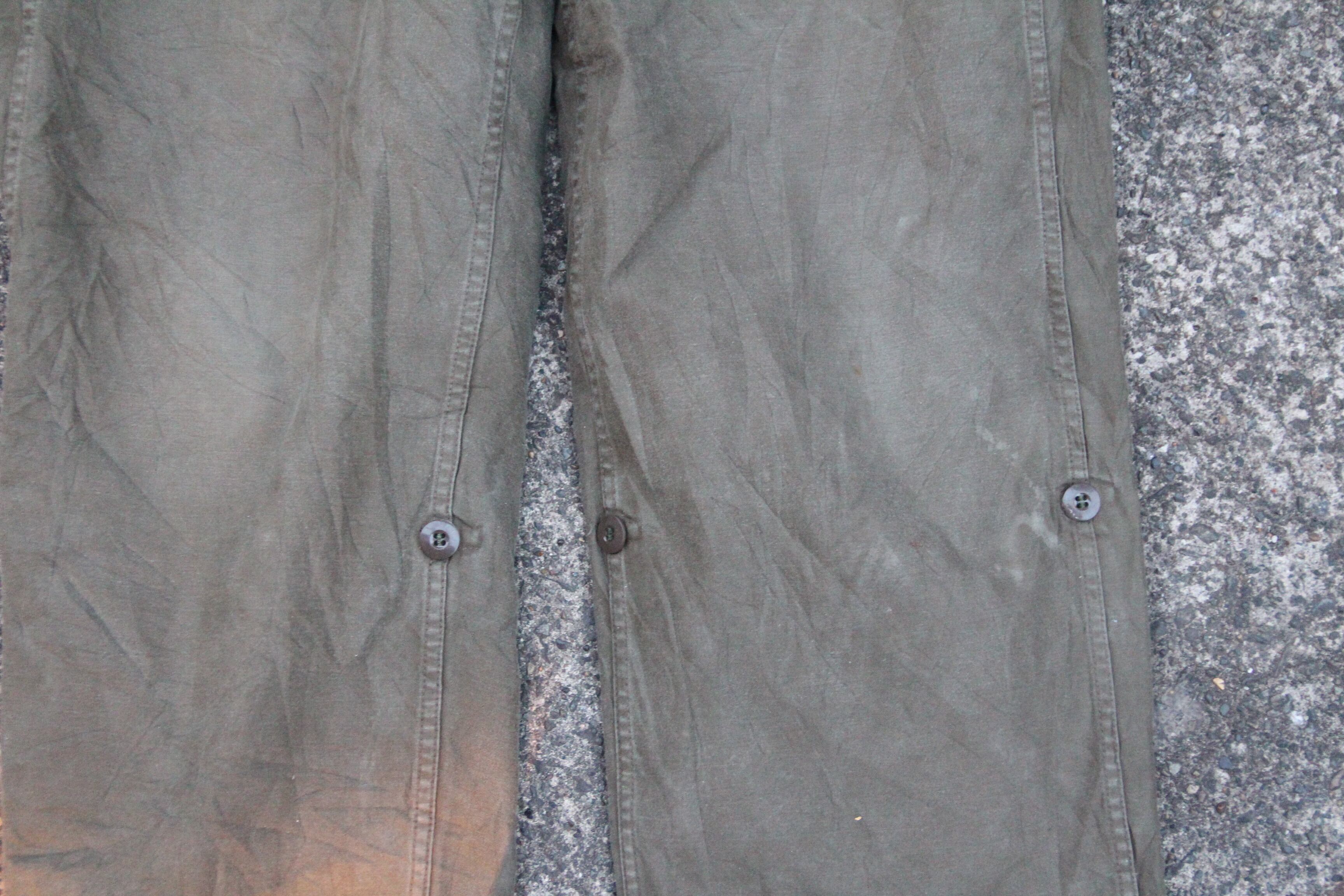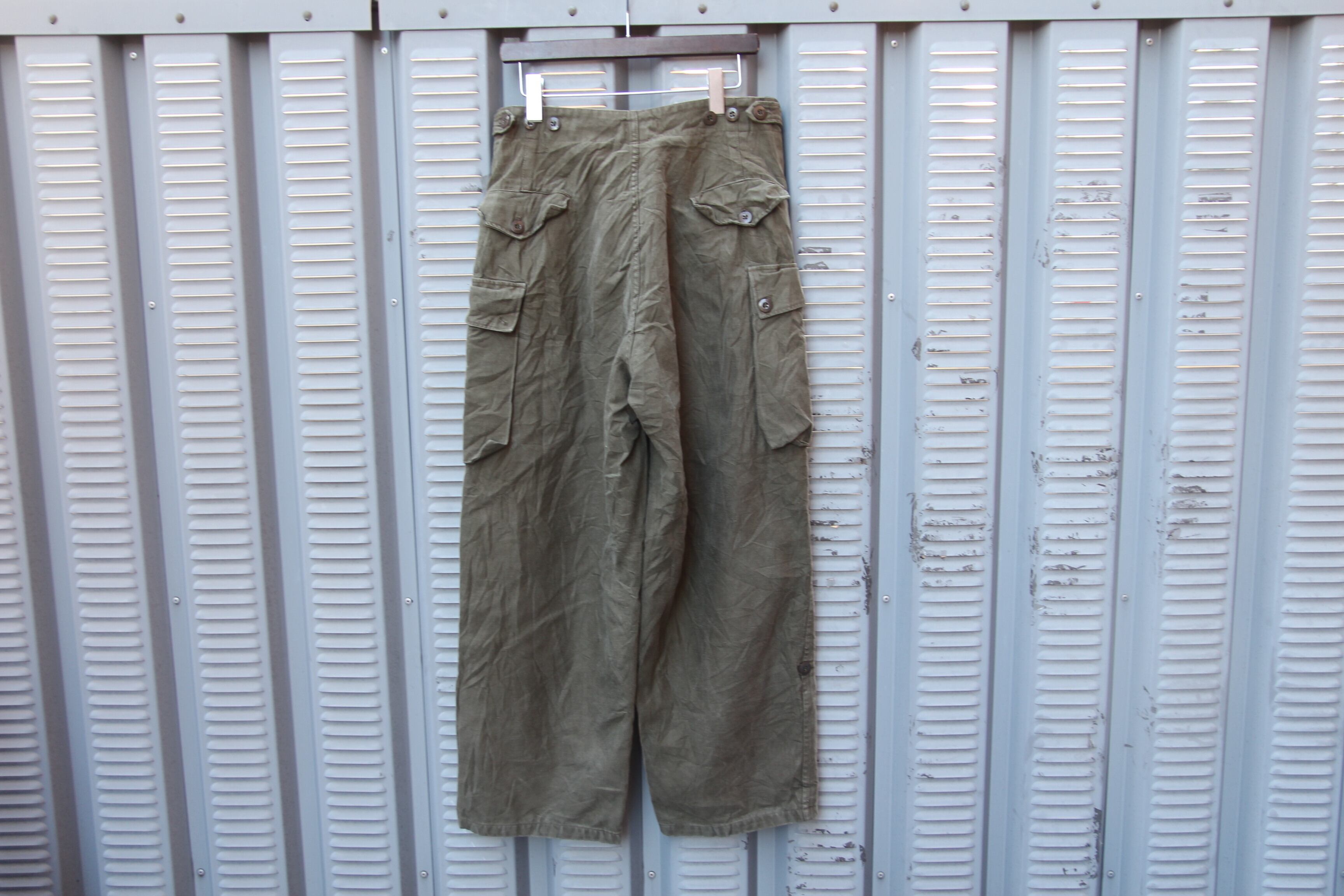 1990年代に生産されたオランダ軍トラウザース(フィールドパンツ)になります。厚手のコットン生地を2枚張り合わせたダブルフェイス仕様で非常にタフで長く履いて頂けます。フラップ付きのバックポケットと両サイドにはかなり大きめのカーゴポケットを配置し収納力のあるデザインです。ウエストは両サイドのアジャスターで調整できます。流行りのルーズなシルエットに加えユーロミリタリーならではの癖のあるディテールが魅力的です。お好きな方は是非この機会にご検討下さい。