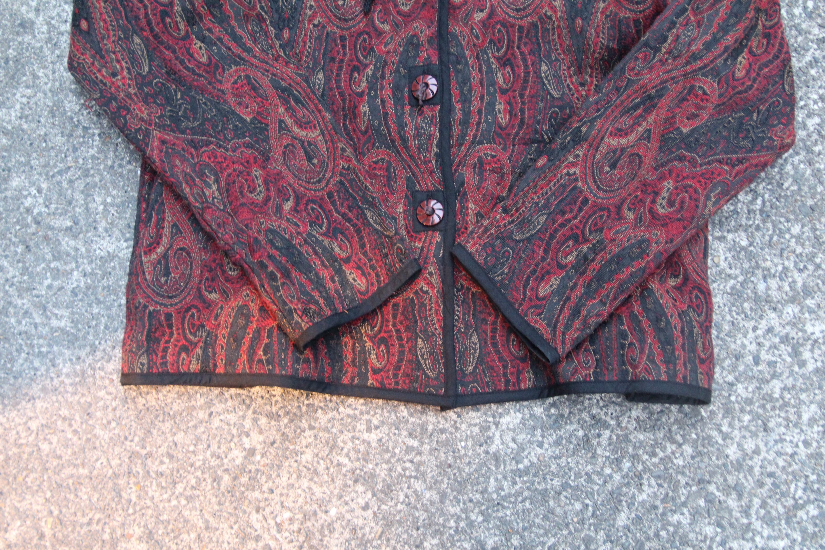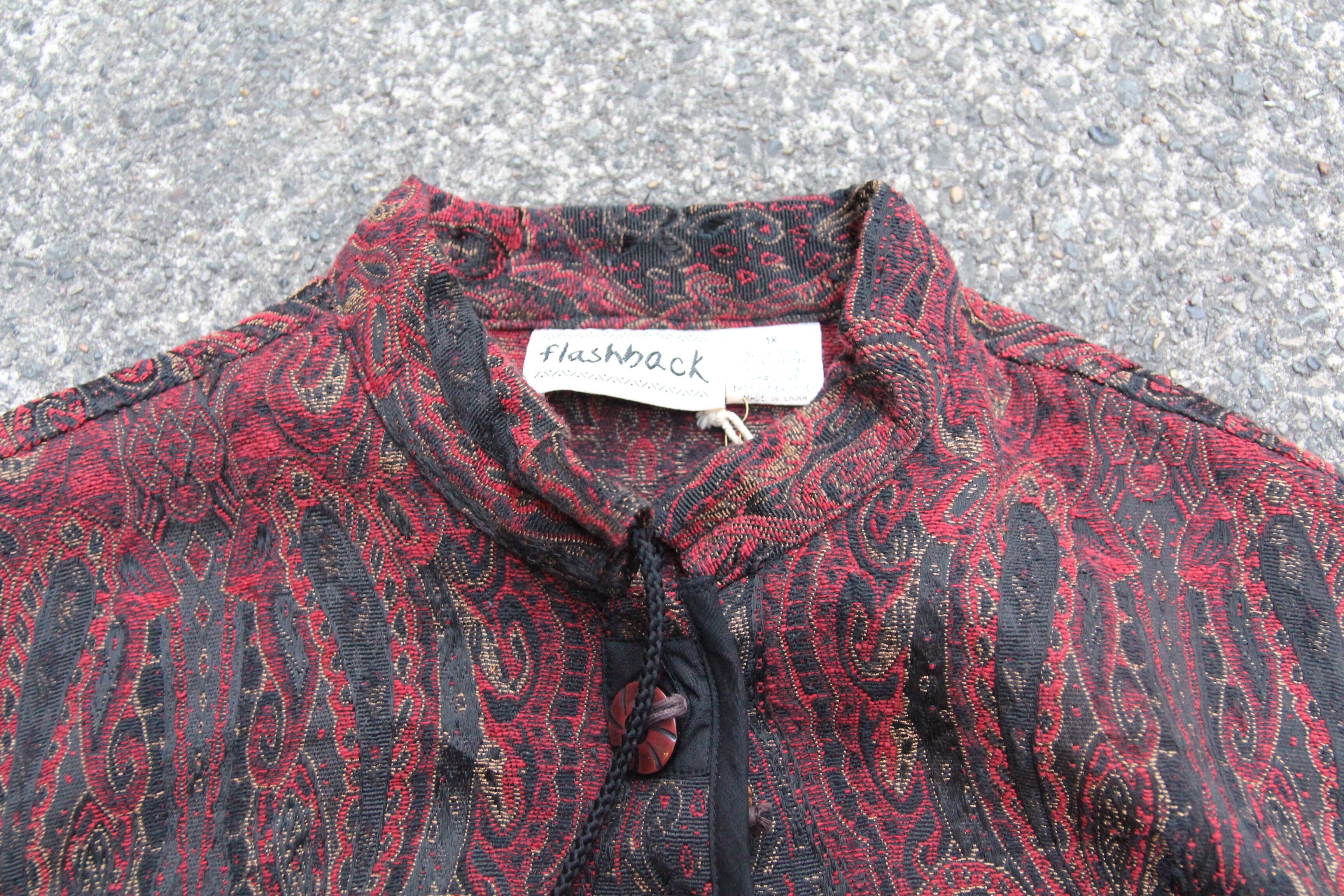 Flashback製のコットンジャケットとなります。ノーカラー仕様で大判のペイズリー柄が独特な雰囲気かつ風合いがあり、ボタン留め等も特徴的な形状となりエスニックらしさも多少感じられるジャケットとなります。ドレッシーからカジュアルスタイルまで幅広くお使い頂けますし、前合わせ的にレディースアイテムとなりますが、サイズ的に勿論男性にも着用頂けますし、女性には大変お勧めです。この手の変わり種雰囲気古着がお好きな方は是非ご検討下さい。