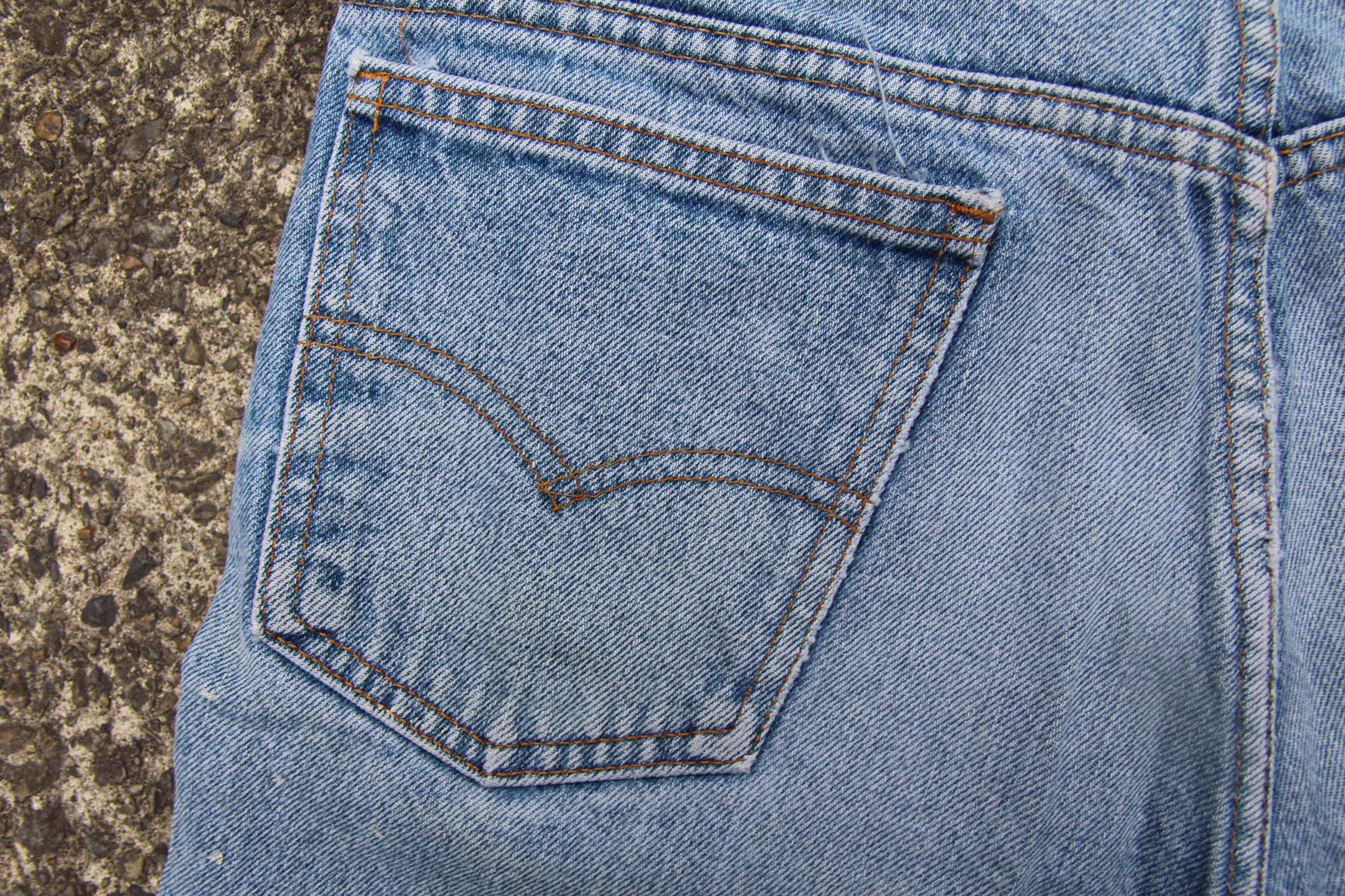 全体的に細かい糸の解れ、ペンキ汚れの他、バック右ポケットに2cm程度の破けが見られますが、その他致命的なダメージは見られません。