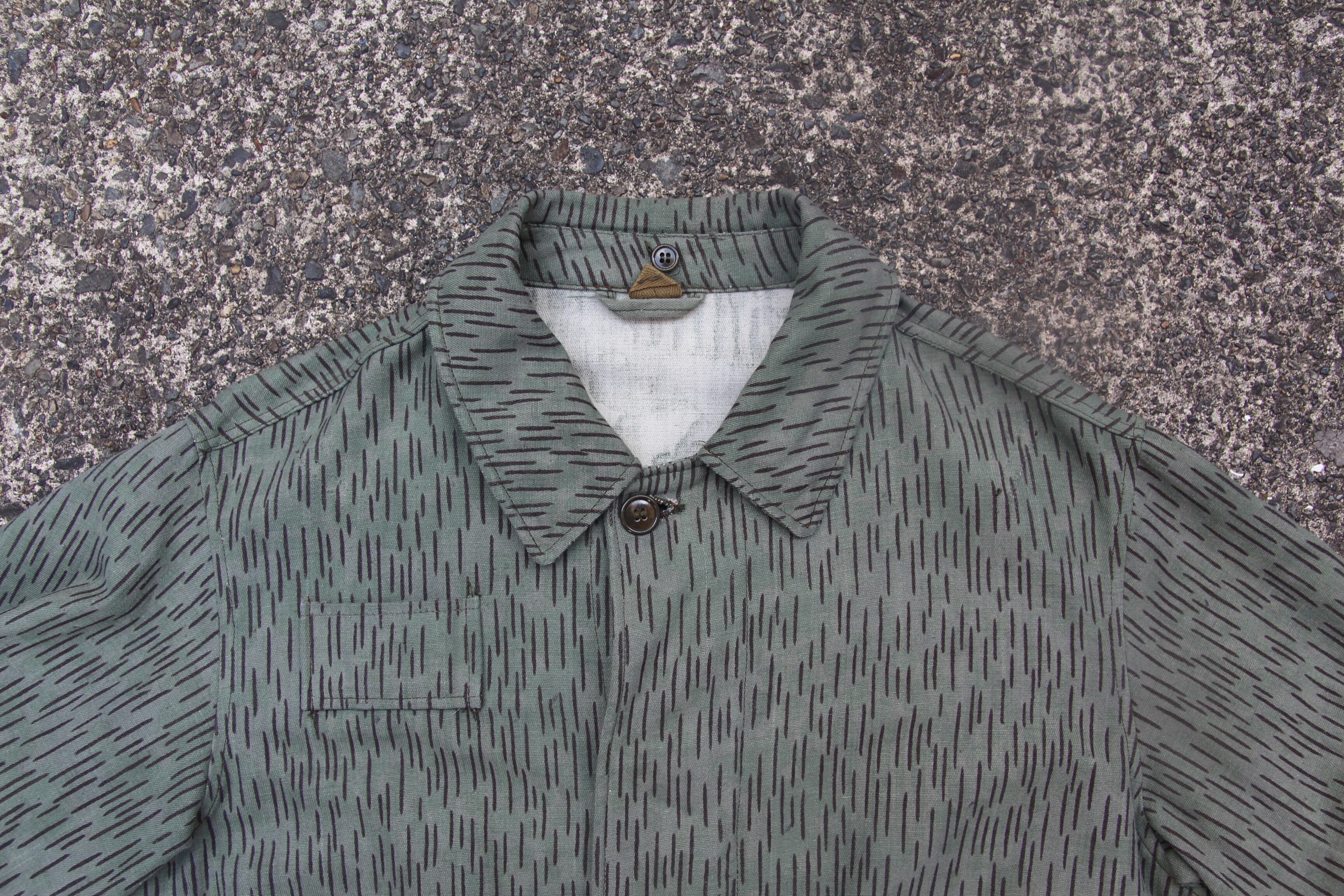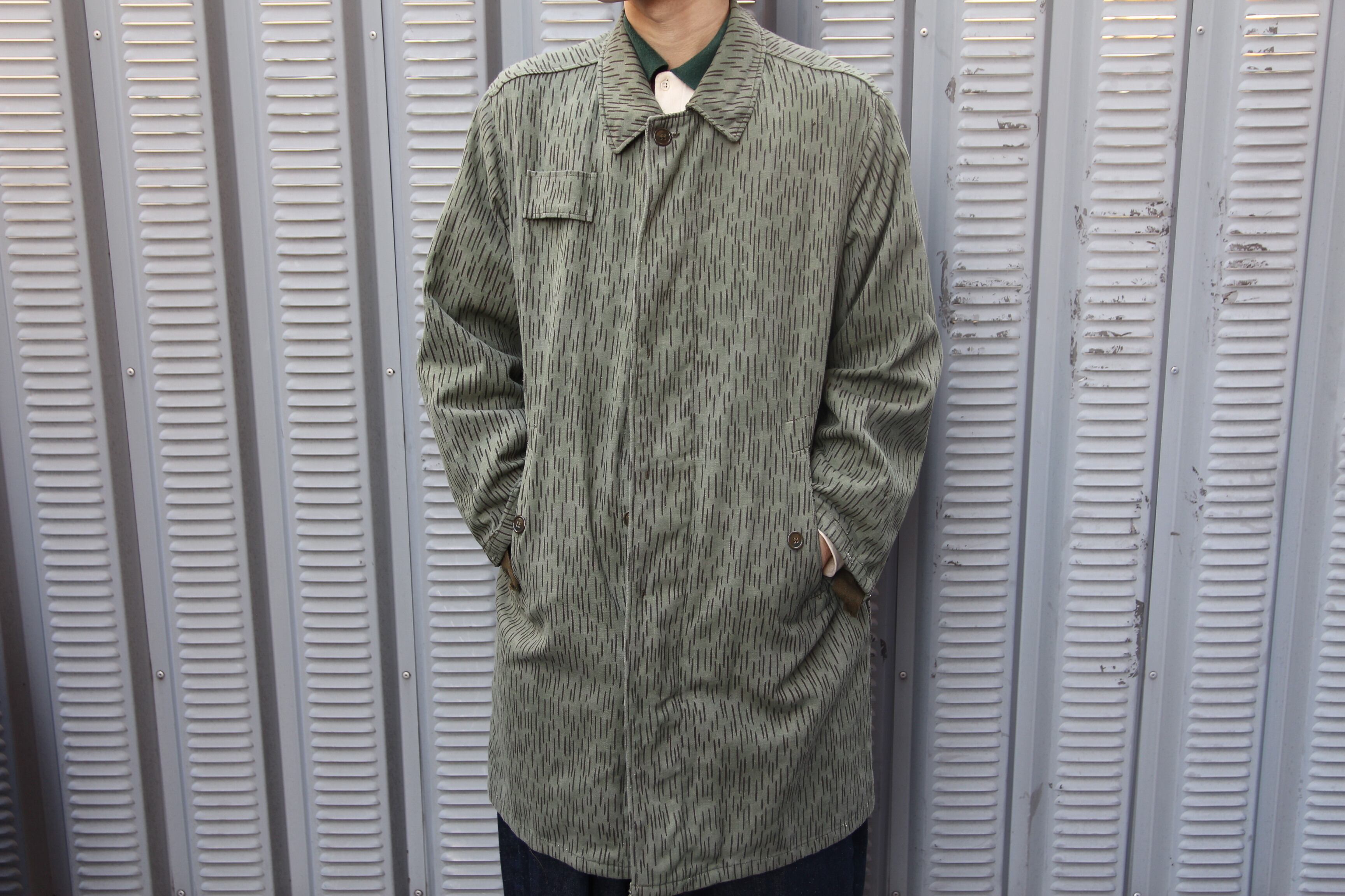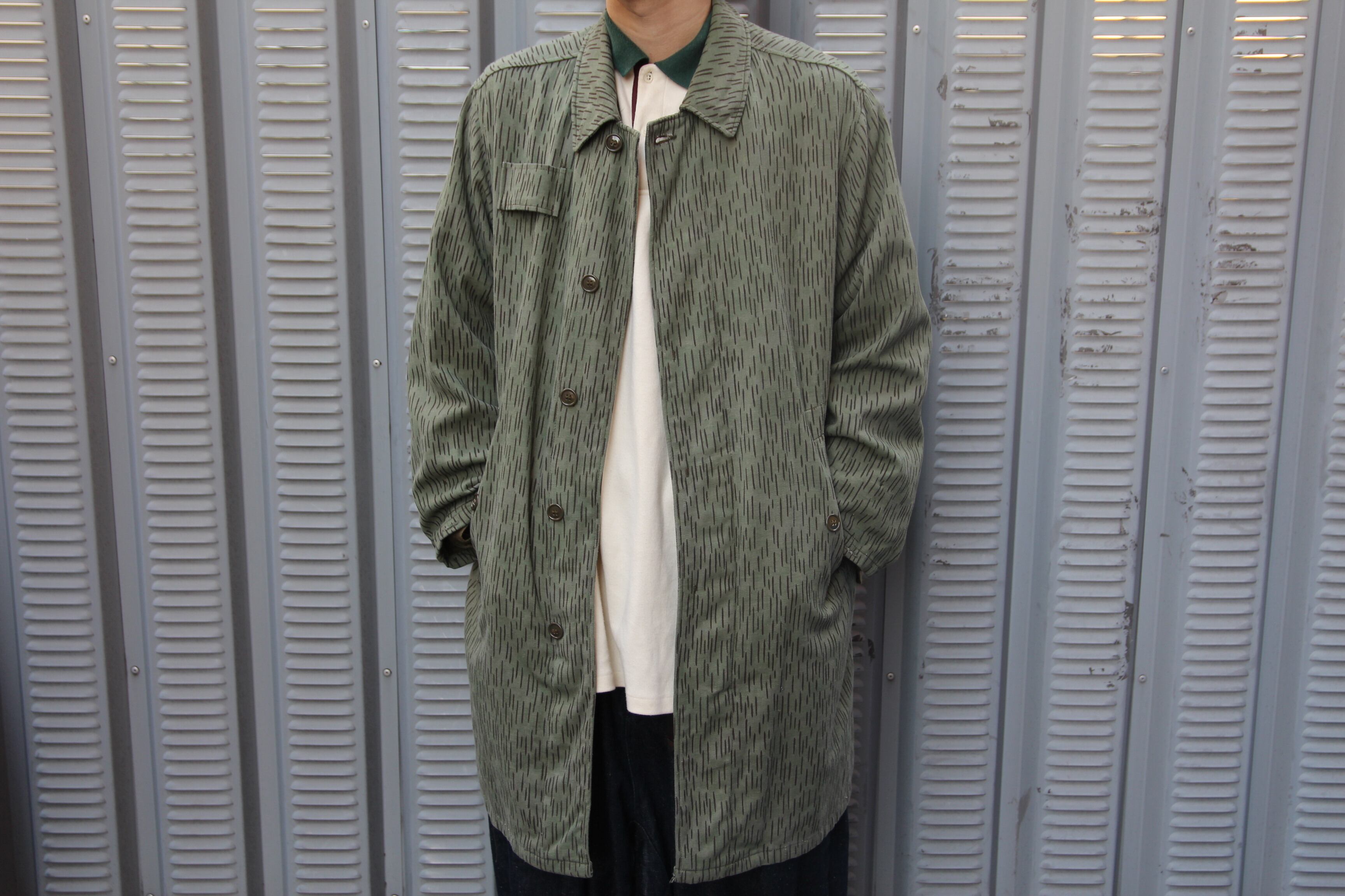 1970年代のチェコスロバキア軍のフィールドコートとなります。雨が滴っている様に見える事からレインドロップカモと呼ばれる柄となり、ドイツ軍を始めユーロミリタリーアイテムに採用されている事が多い柄パターンで、こちらはM60と呼ばれているフィールドコートとなります。セミロング丈のシンプルな作りに細かいディテールが面白く、胸にストラップ、ハンドポケットが左右に付き、バック片面のみにポケットが付きます。インナーポケット裏に年代等刻印スタンプも押されております。サイズも2Aと程良い大き目サイズとなりますのでユーロミリタリーのこの手のコートがお好きな方は是非この機会にご検討下さい。