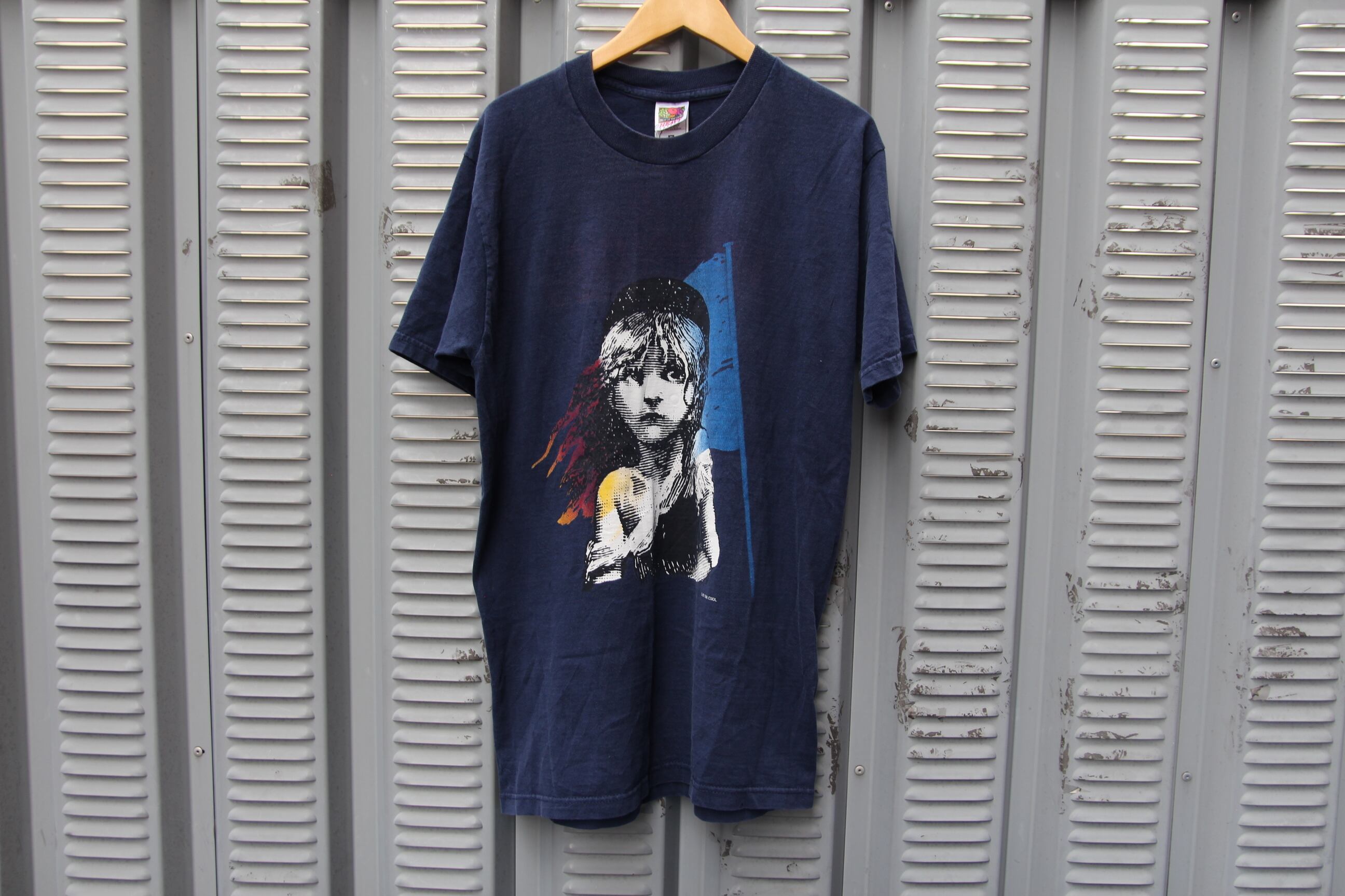 FOTL製レ・ミゼラブルのプリントTシャツになります。言わずと知れたミュージカル、映画化までされている名作Les Miserables(レ・ミゼラブル)ですが、こちらの商品はダブルステッチでコピーライトは1986年、フロントにはお馴染みのグラフィック、背面にはタイトルがプリントされたデザインとなります。よく見かけるレ・ミゼラブルTシャツですが、FOTLのボディでネイビーのカラーリングの物は珍しいのではないでしょうか?ネイビーにお馴染みのプリントデザインがよく映えます。サイズほMで女性の方にもゆったり着て頂けるサイズ感ですので気になる方、お好きな方は是非この機会にご検討下さい。