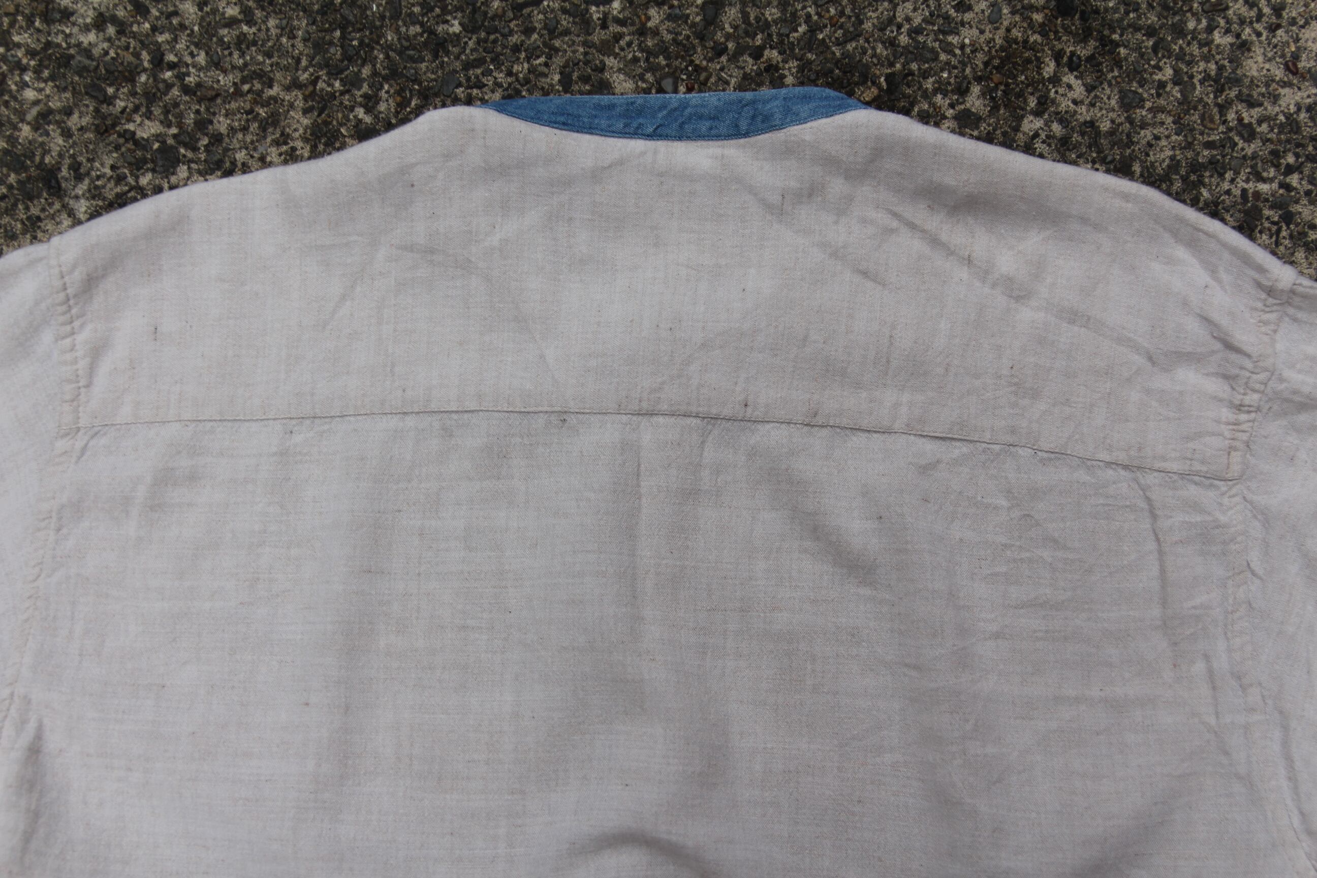 コットン×リネンの混合素材に白のカラーリングが涼しげで、程良いヴィンテージの雰囲気も兼ね備えたこれから暖かくなる今時期にピッタリなアイテムです。素材感だけでなく襟のデニム素材やポケットにうっすらと入る刺繡等、細かいデザインが可愛らしくシンプルながらどこか古着の楽しさを感じられる1着かと思います。サイズLと大き目のルーズなサイズ感で、シーズン問わず通年着て頂けるアイテムですので気になる方、お好きな方は是非この機会にご検討下さい。