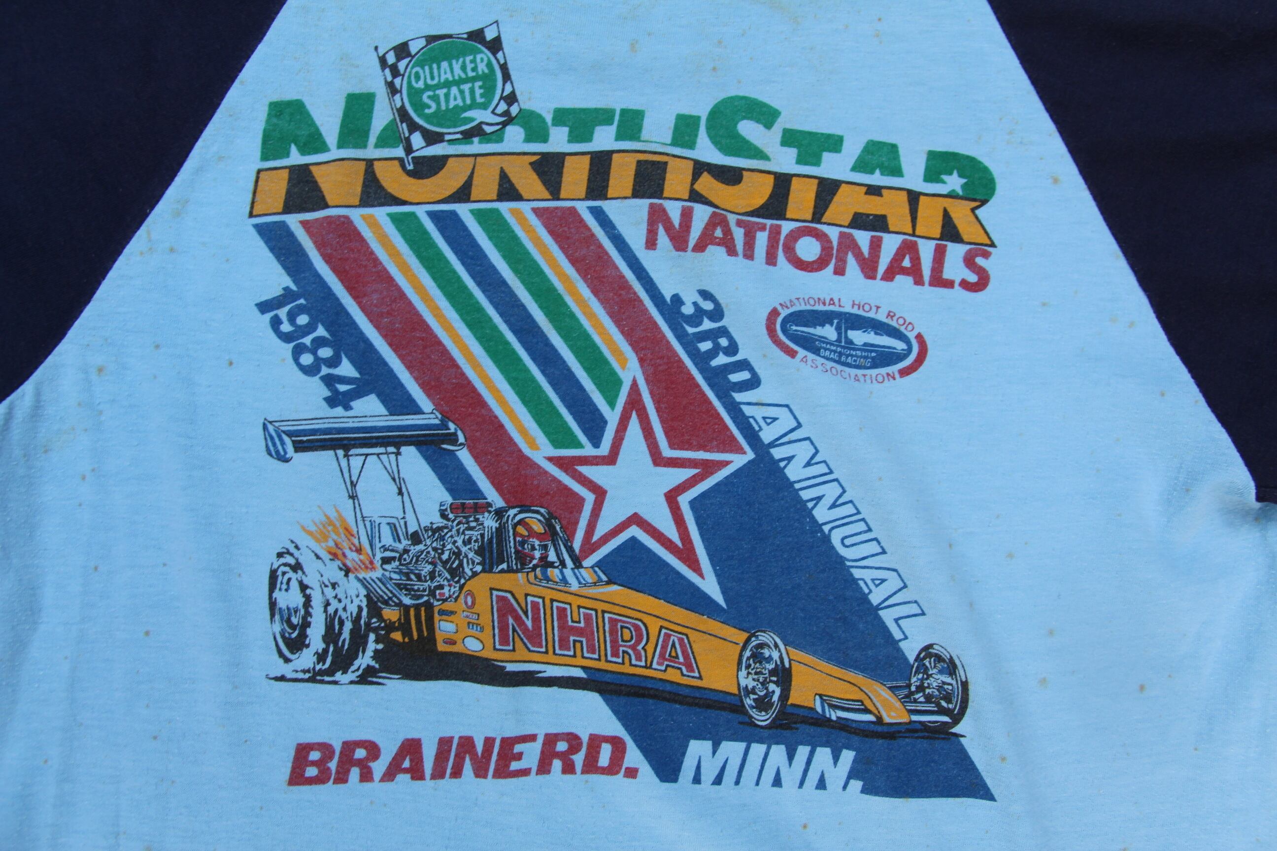 1980年代頃のBreakaway製NHRA NORTHSAR NATIONALSのラグランTシャツです。NHRAとは"Nstional Hot Rod Association"の略で、アメリカにおけるドラッグレース統括団体の1つです。アメリカ国内とカナダの北米を中心にレースシリーズを開催し、世界最大の会員数を誇る自動車クラブという1面もあります。こちらの商品はそんなNHRAの1984年大会のインパクトのあるプリントが目を引く1着です。US物らしい配色とプリントデザインが可愛らしく、さらにモーター系では珍しくラグラン仕様な点も魅力的かと思います。NHRA物は球数が少なくモーター系の中でも人気の高いアイテムかと思いますので、気になる方、お好きな方は是非この機会にご検討下さい。