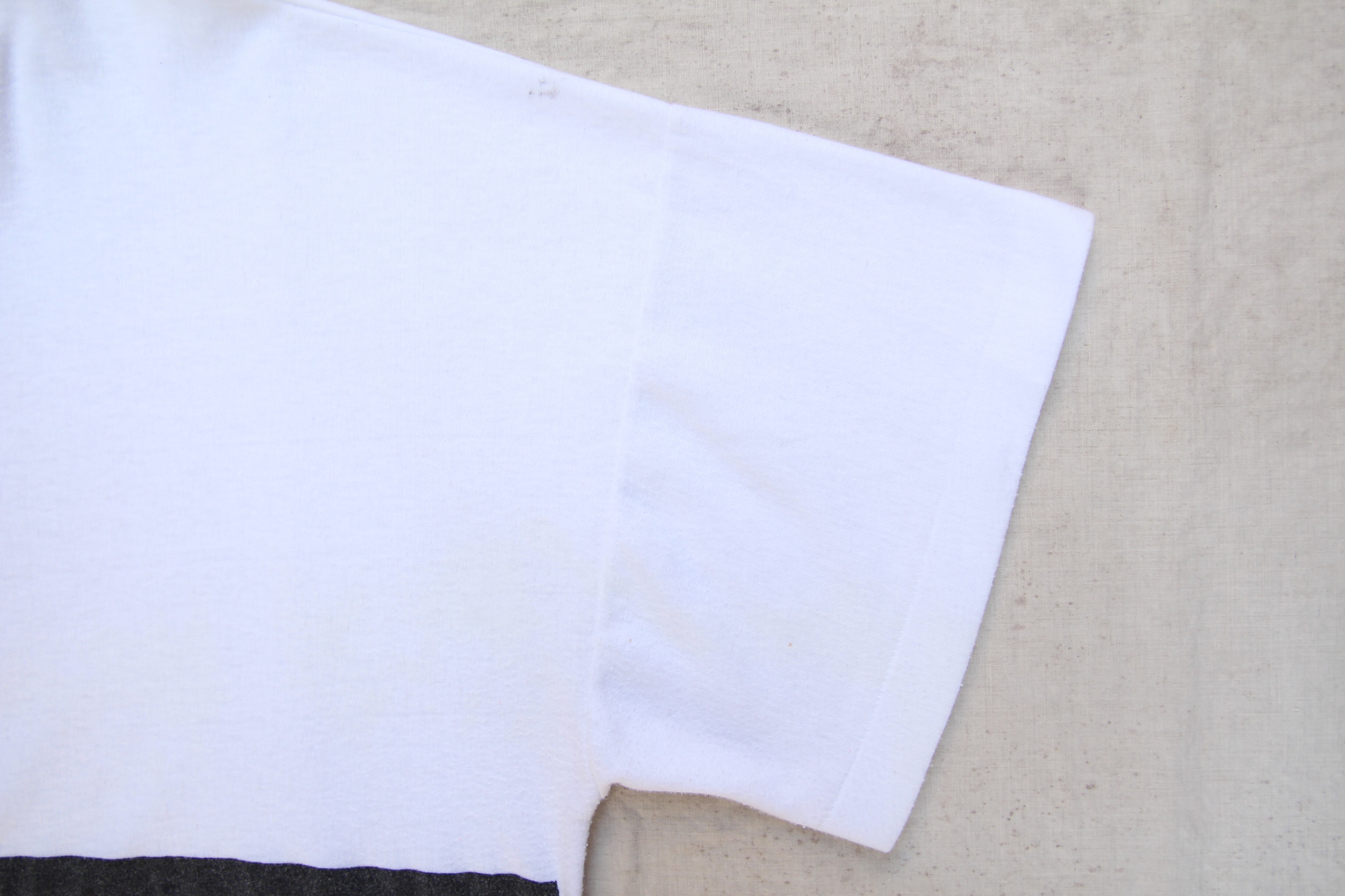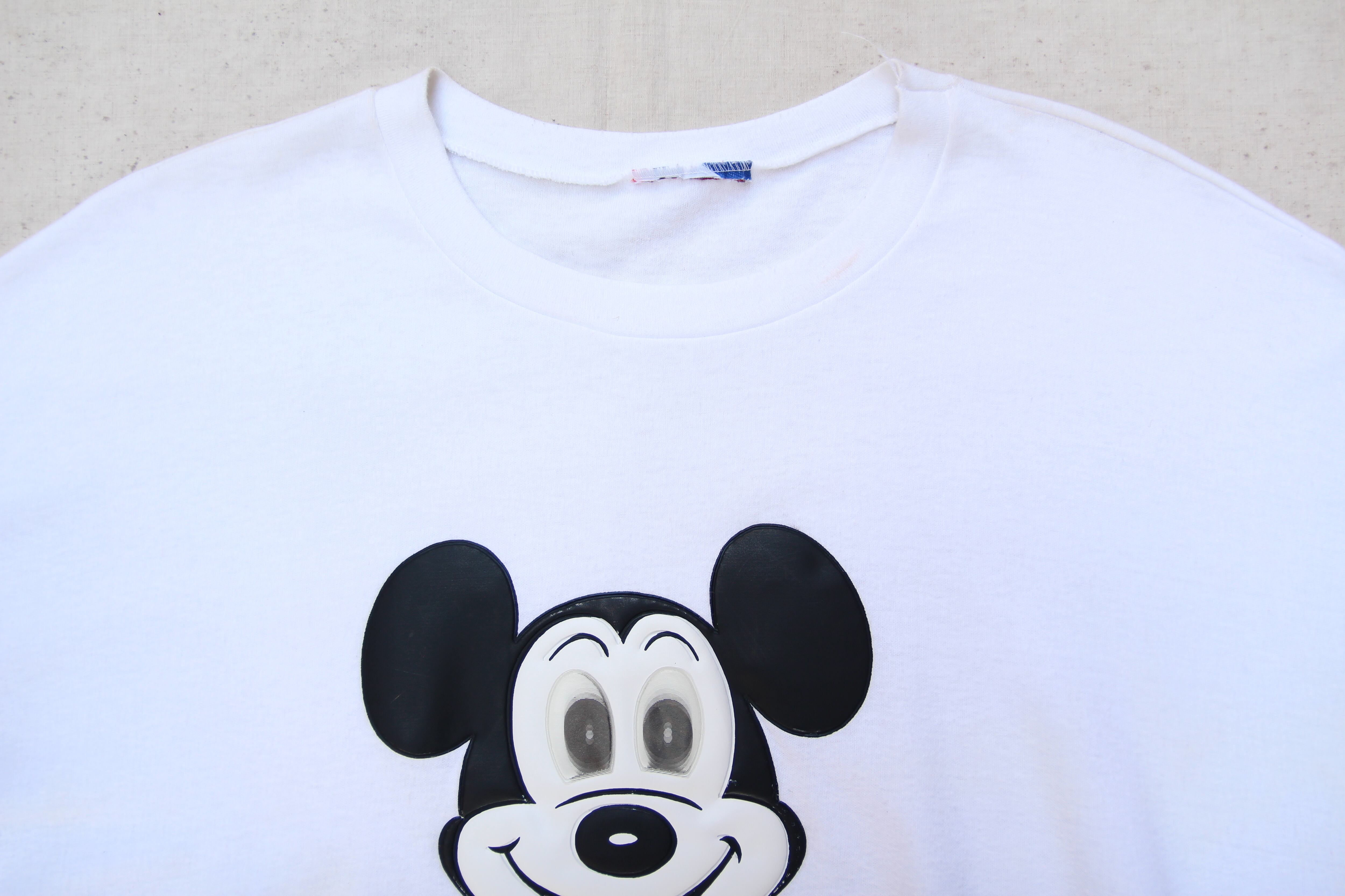1990年代頃のWalt DisneyオフィシャルのTシャツとなります。フロントのみにプリントとミッキーの装飾が付いており、ミッキーの目がフォノグラムシールが貼られており、揺れると動くユニークなデザインとなっております。ボーダーとMickey表示の部分はプリントとなります。プリント下部にコピーライトも入る点から恐らくオフィシャル物かと推測され、Disney Japanでは生産されない様なデザイン製も魅力です、サイズもL程度で、身幅が広く、着丈が多少短めな独特なサイズ感となります。基本的にオーバーシルエットで着用頂けるかと思いますので、完全変化球のミッキーTシャツをお探しだった方は是非この機会にご検討下さい。