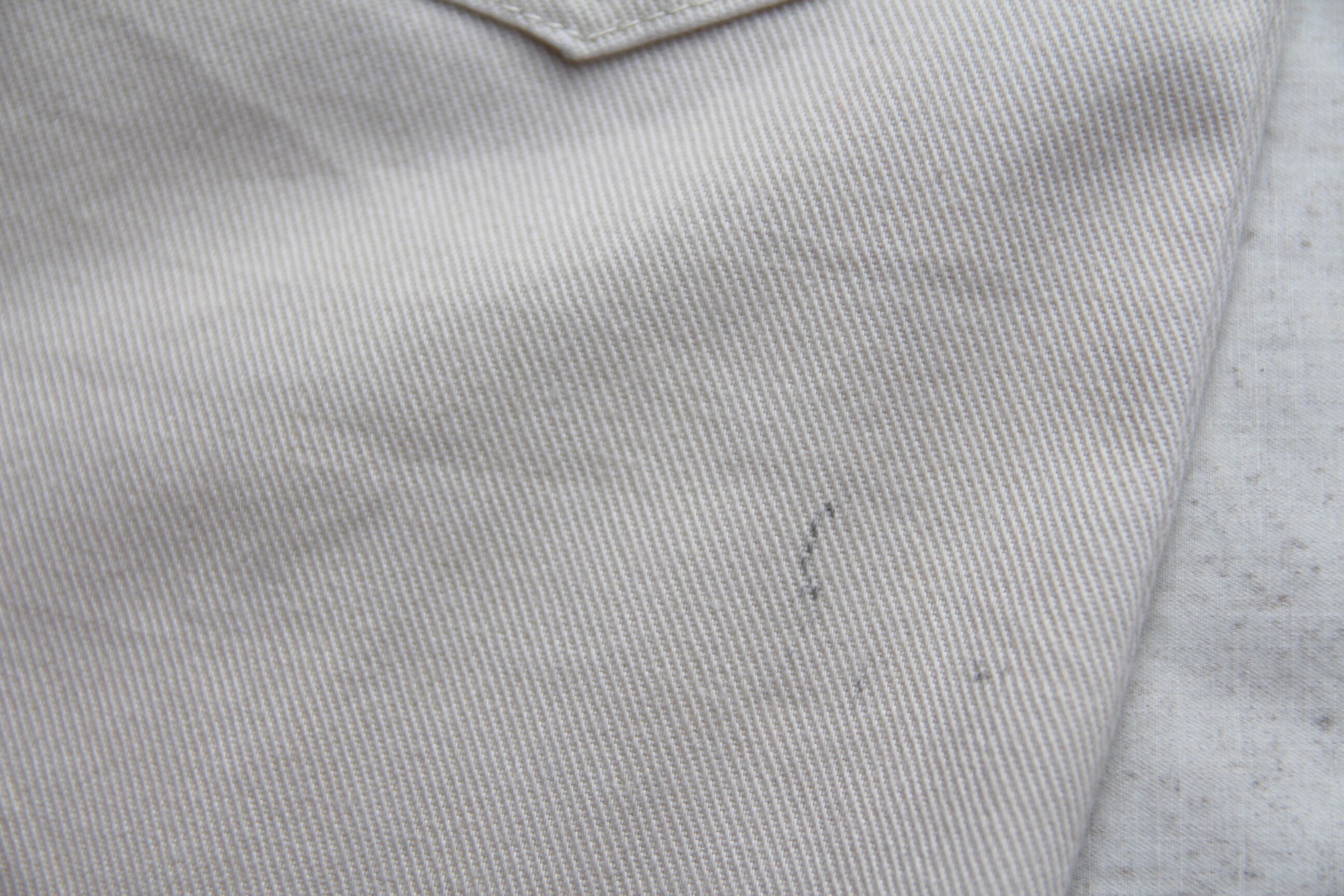 フロント左太腿付近に引っ掻き傷の様な生地擦れが数ヶ所有り、両膝部分に黒ずみ有り、バックポケット下付近に汚れが数ヶ所有り、他全体的に細かい染み汚れ、生地擦れが、使用感が多少見られます。