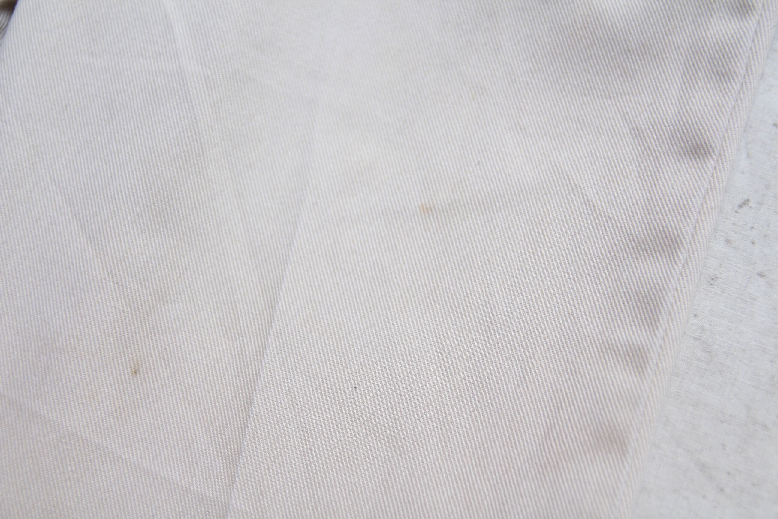 1970年~80年代頃のUSA製LEE(リー)のコットンツイルパンツになります。デニム等と比べて格段に球数の少ないカツラギの愛称でも知られるコットン×ポリエスター混合のツイル素材で、カラーは扱いやすいベージュとなっております。ボタンには”LEE RIDERS"の刻印、ジップは42TALONが使用されており、ウエストバックには塩ビ素材のパッチ付き、バックポケットに付くピスネームにはRマーク・MRマークどちらも入ります。センタープリーツの入るタフな生地感で、ワークウェアのような均衡のとれた太すぎないストレートシルエットも魅力的です。こちらの商品の様にゴールデンサイズの物となると特に球数の少ない希少なアイテムかと思いますので、お好きな方は是非この機会にご検討下さい。