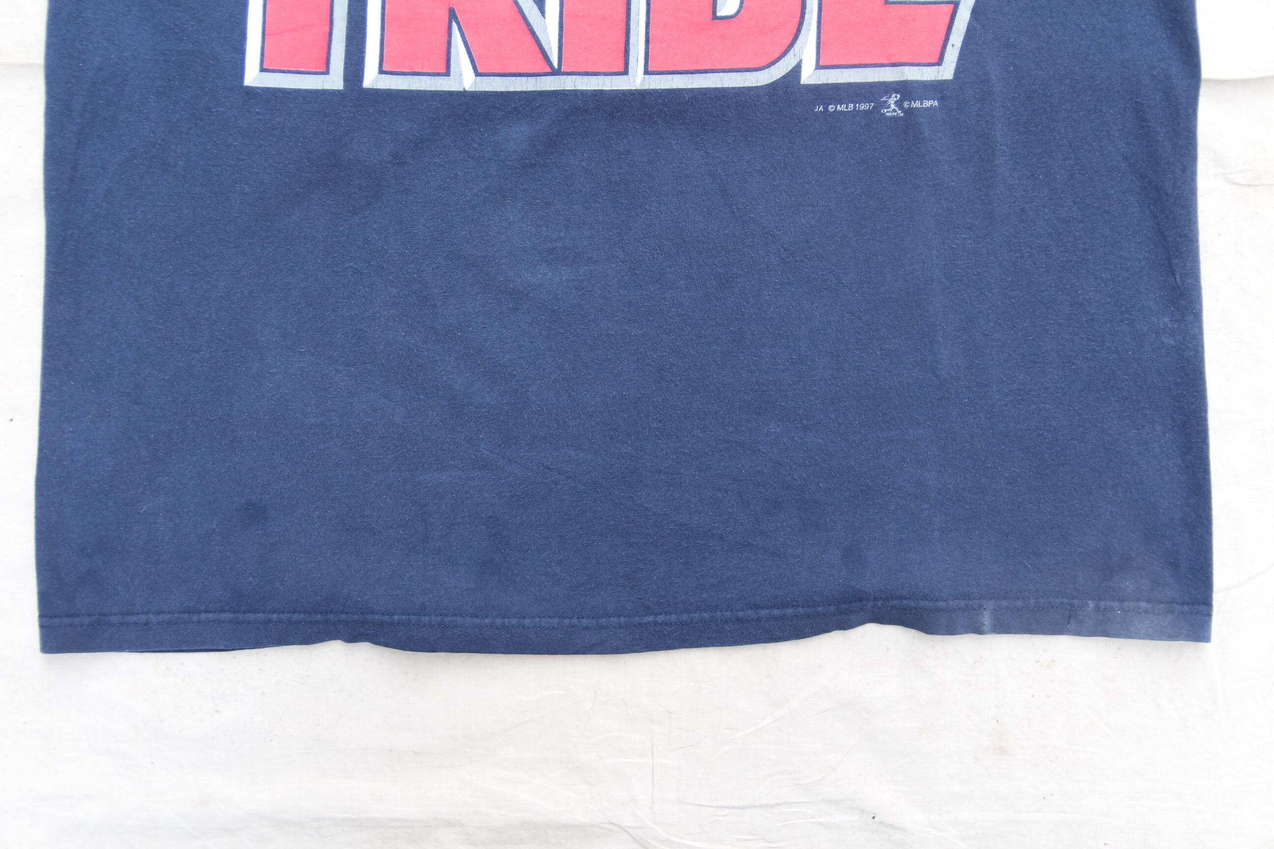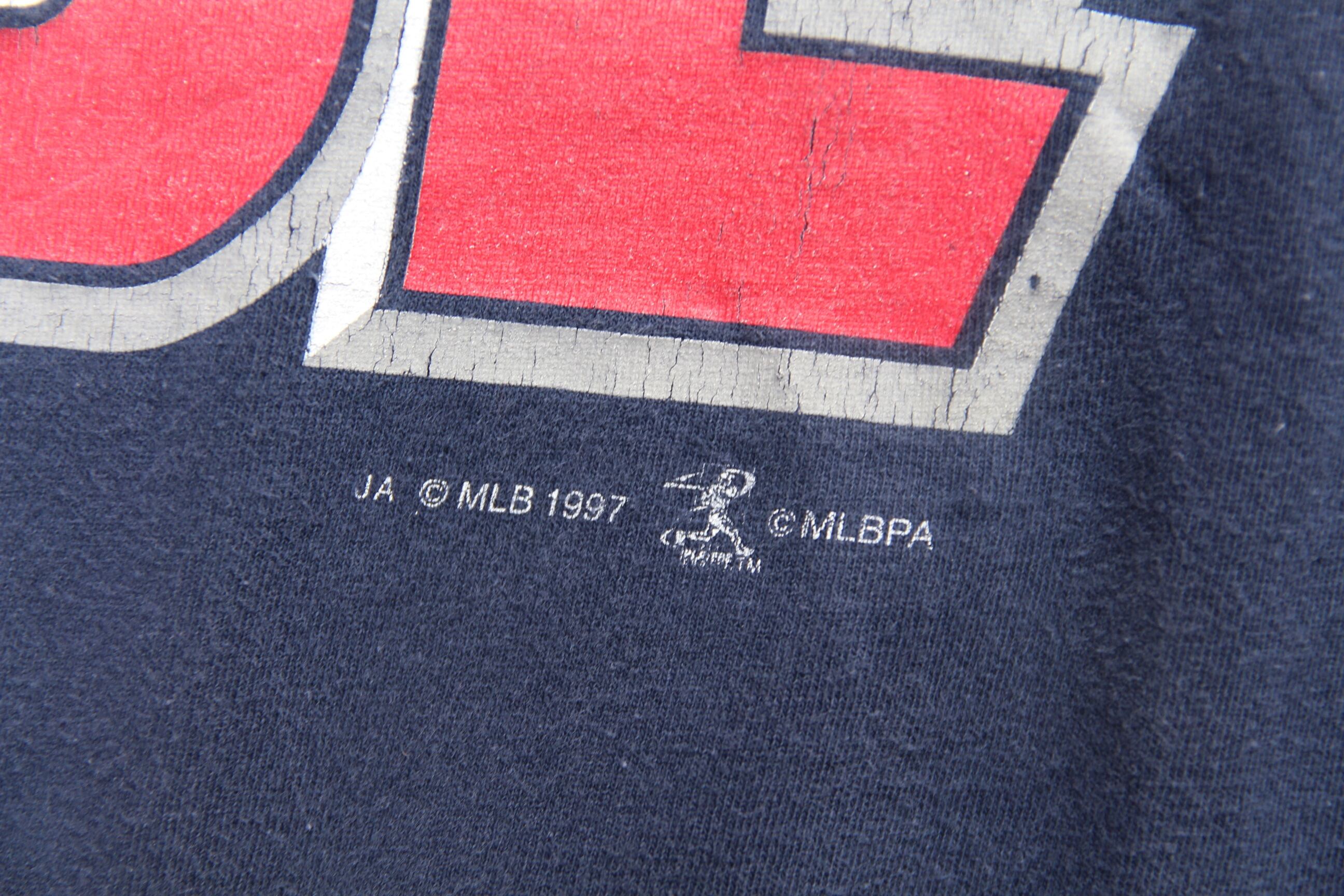 1990年代頃のSport Attack製プリントTシャツになります。アメリカメジャーリーグベースボールに加入しているチームの1つであるクリーブランドインディアンズのプリントがフロントバックに大胆にプリントされております。1997年のワールドシリーズにインディアンズが進出し、当時のチームメイトの表記もございますので、ワールドシリーズ中に販売されたグッズのひ1つだと推測出来ます。1997年のコピーライトが入るのも嬉しいポイントです。ネイビー地にレッド、ホワイトがベースの非常に使い易い配色切り替えになっておりますのでお好きな方も多いのではないでしょうか。2019シーズンにインディアンズの球団ロゴであるワフー酋長の使用が廃止され、最近ではチーム名もガーディアンズに変更になりましたので、ワフー酋長のロゴが付くもの、インディアンズ表記のあるものはこれから価格が高騰して行くであろうアイテムになります。是非インディアンズがお好きな方やお探しだった方はこの機会にご検討ください。
