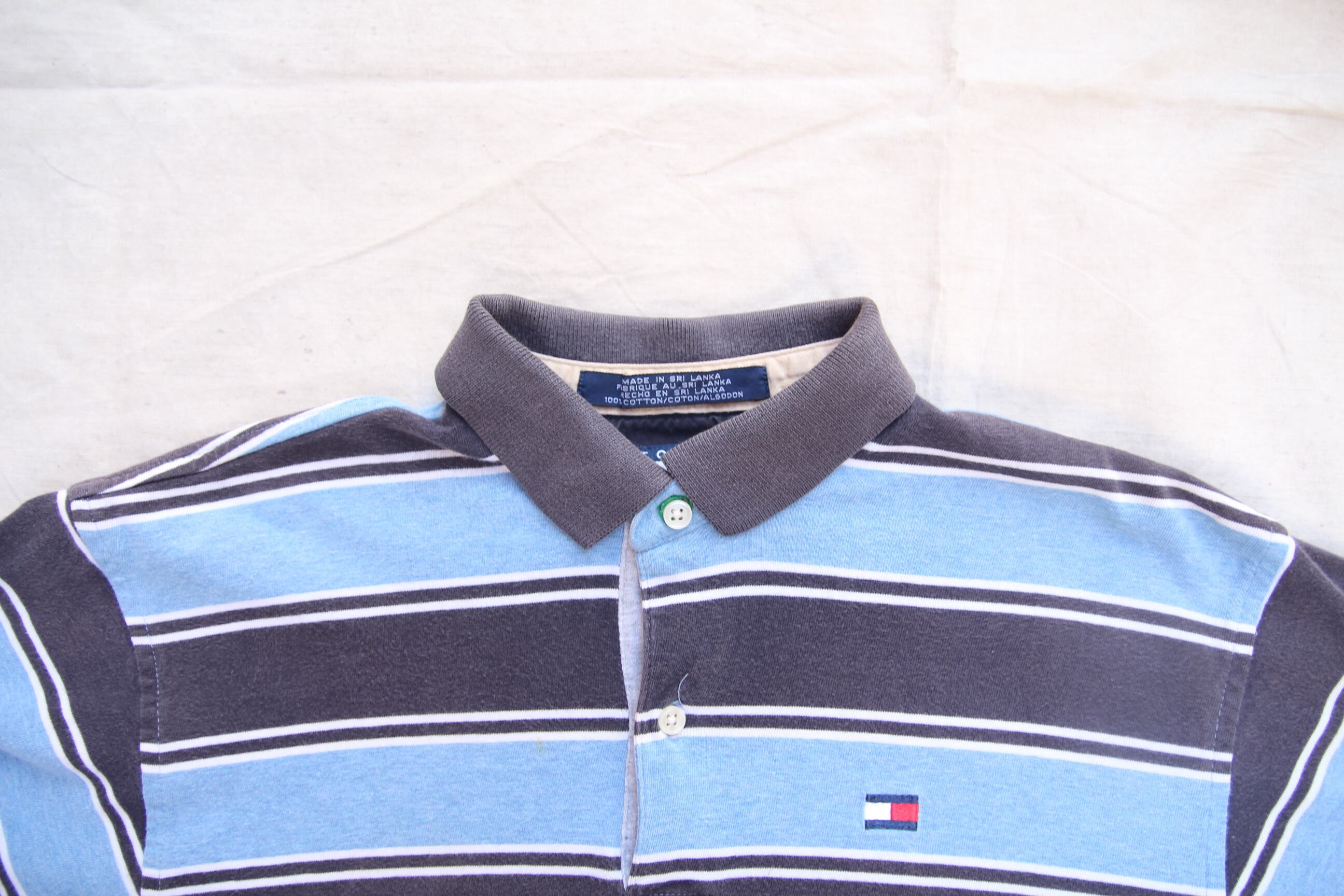 TOMMY HILFIGER製のボーダーポロシャツになります。ネイビーとサックスブルー、ホワイトのバランスが春夏らしく涼しいアイテムです。男性でも女性でも着て頂けるユニセックスなデザインになりますが、サイズ感が小さ目になるので特に女性にお勧めなポロシャツになります。デニムは言うまでもなく、チノパンやスラックス等でフランスっぽい着こなしも非常に可愛らしいかと思います。前後でも着丈の長さが違い、前上がりになりますので着用時のバランスが取れたポロシャツだと思います。ポロシャツが有名なブランドでも無地の物や胸のワンポイントロゴのみのものが多いと思いますが、こちらは柄感、サイズ感、どれを取っても非常に古着らしいポロだと思いますのでお好きな方やお探しだった方は是非この機会にご検討下さい。