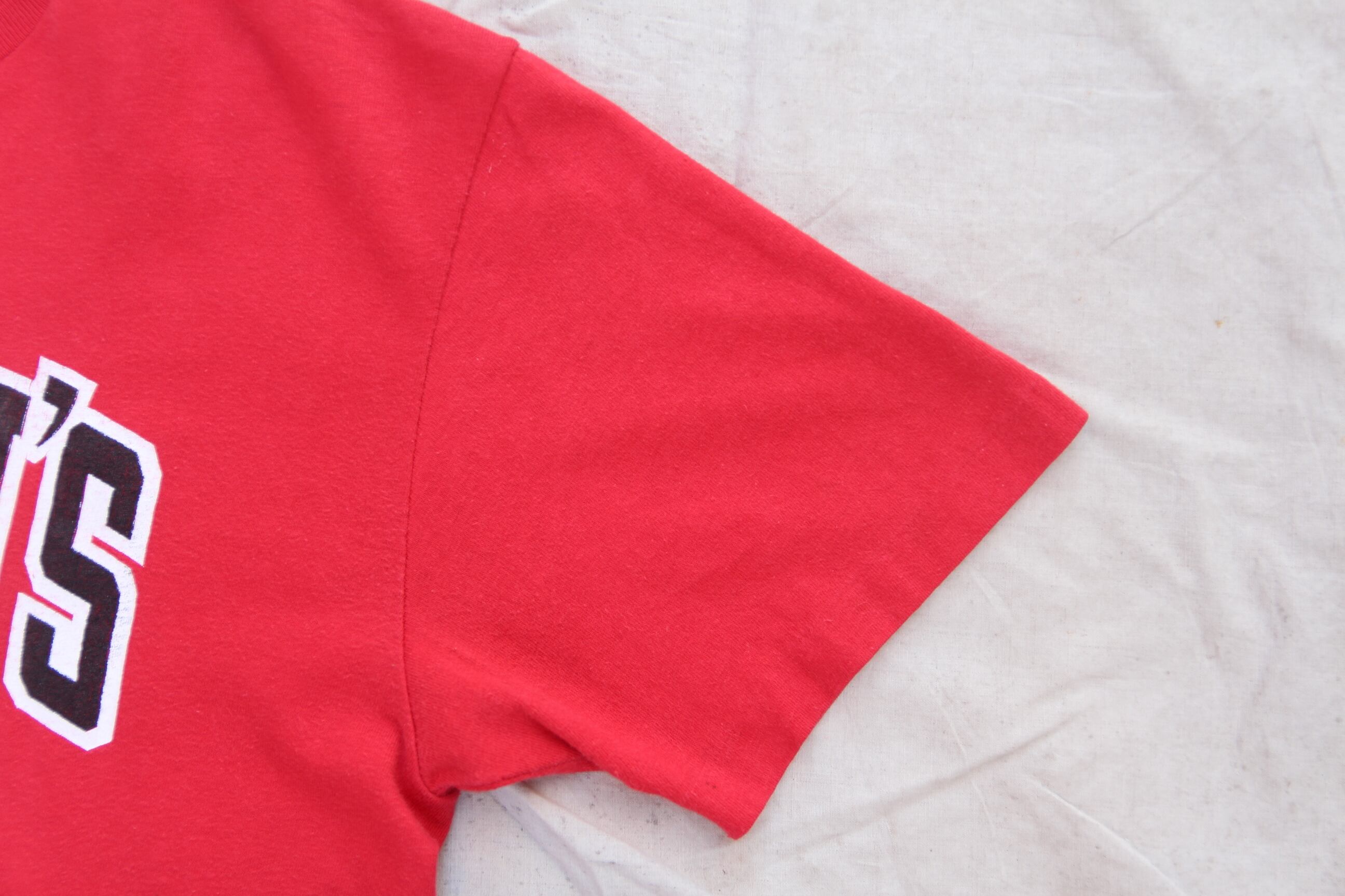 1980年代頃のStedman製ボディのプリントTシャツになります。こちらはカレッジスポーツのTシャツになりまして、プリントはセントジョンズ大学のバスケットボールチーム、セントジョンズレッドストームのプリントがされております。スクールカラーでもあるレッドカラーとブラック、ホワイトでシンプルかつインパクトあるデザインが特徴的かと思います。プリント中央にはイメージキャラクターのレッドマンがリアルに描かれております。サイズはMサイズ表記で、男女共にご着用頂けるサイズ感になります。デニムを合わせて王道のアメカジスタイルや、綺麗めなアイテムでまとめたスポーツMIX、幅広くお使い頂けるアイテムかと思いますのでカレッジスポーツがお好きな方やお探しだった方は是非この機会にご検討下さい。