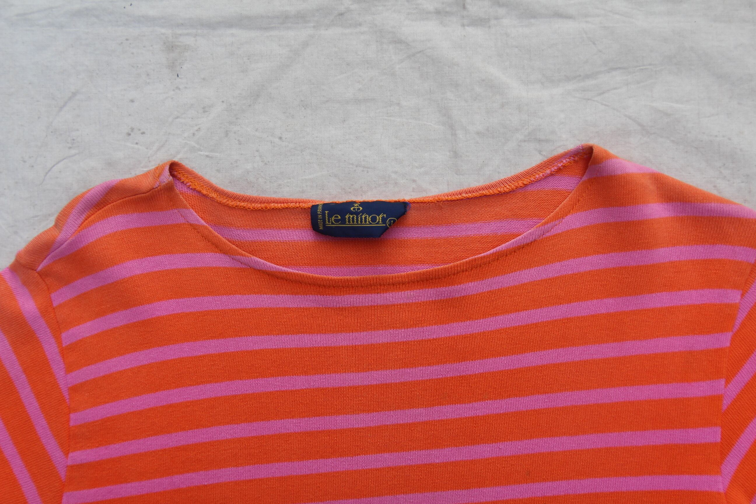 80's~ Le Minor ボーダーバスクシャツになります。1936年フランスのブルターニュ地方で生まれたルミノア。バスクシャツが有名なブランドと言えばセントジェームスやオーシバルが思い浮かぶかと思いますが、前者がしっかりとガサっとしたコットン地なのに対し、ルミノアはバルキーな生地ながらもソフトな肌触りを特徴とし、しなやかな着心地がございます。80年代製のクタっとしたコットン地というのも相まってより一層着用感は心地よく、そのため女性の方にも非常にご着用頂きやすいかと思います。マリンをイメージとしたそのボーダーシャツはチノパン、ボーダーハットやパナマハットなどと相性抜群です。ボーダーの配色もオレンジとピンクの好配色になりますので一枚でも差し色としても。是非お好きな方やお探しだった方はこの機会にお試し下さい。